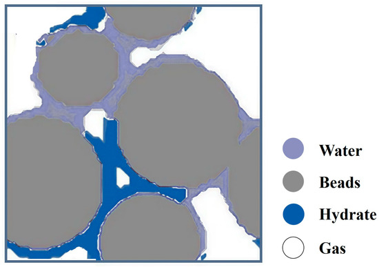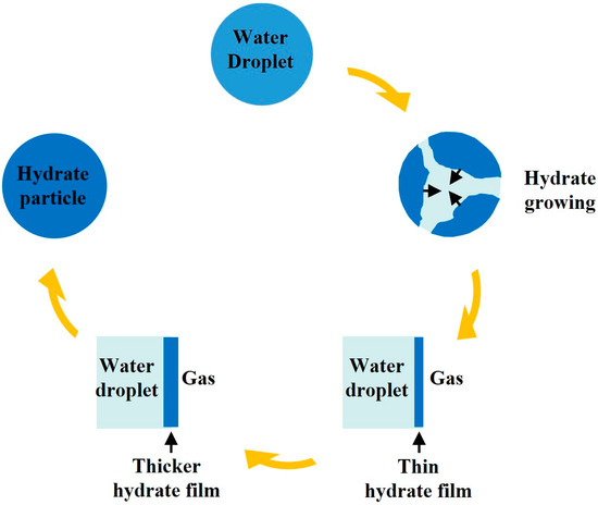 The general molecular formula of NGHs can be written as M·NMH2O, where M and NM are the hydrate guest molecule and hydration number, respectively. Organic matter deposited beneath the seabed and continental rock layers decomposes under the action of microorganisms, producing sufficient gas [16], which provides the raw material for hydrate formation. Figure 1 shows a schematic diagram of NGH particle formation redrawn from Davies et al. [17]. As shown in the diagram, under conditions suitable for hydrate formation and with abundant gas, NGHs begin to be generated at the gas–liquid interface. Subsequently, due to the hindrance of the formed hydrate layer between the gas and the liquid phase, further hydrate formation is restricted, and the formation rate gradually slows down [17]. In porous media, hydrates exist by coating the grains when the gas phase is sufficient and the surface of the porous media particles is hydrophilic. After the hydrate formation process, a small amount of water will exist below the hydrate layer [18]. However, when the gas phase is scarce or even dissolved in the aqueous phase, or when the surface of the porous media particles is hydrophobic, hydrates are formed in the porous media in the form of pore-filling or a combination of pore-filling and partial grain-coating [18].