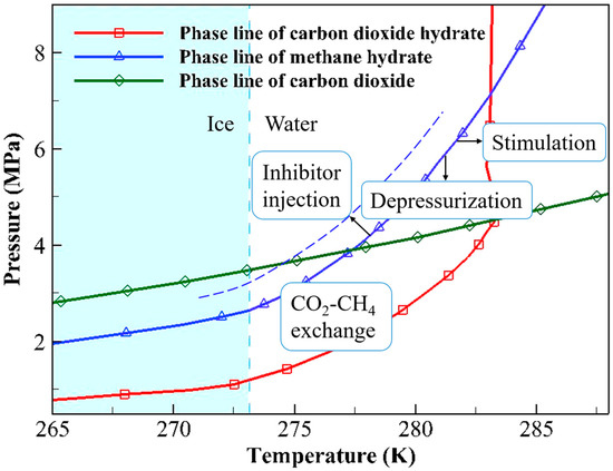 Most of the guest molecules of NGHs found in nature are CH4, so the research on NGHs extraction is mainly carried out around CH4 hydrate. The CH4 hydrate, CO2 hydrate, and CO2 phase equilibrium curves are displayed in Figure 2. As shown in Figure 2, when the environmental temperature and pressure are above the hydrate equilibrium curve, the hydrate remains in a stable state; conversely, the equilibrium state of the hydrate is disrupted, resulting in the decomposition of the hydrate into water and gas. Therefore, the essence of CH4 hydrate extraction is to disrupt its original thermodynamic equilibrium to release CH4 molecules. Traditional CH4 hydrate extraction methods include depressurization, thermal stimulation, and inhibitor injection. New extraction methods include CO2-CH4 hydrate replacement and the solid fluidization method [19]. A brief introduction to each method follows.