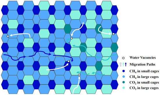 Schematic diagram of the migration paths of CO2 and CH4 molecules in the hydrate modified after Salamatin et al. [5].