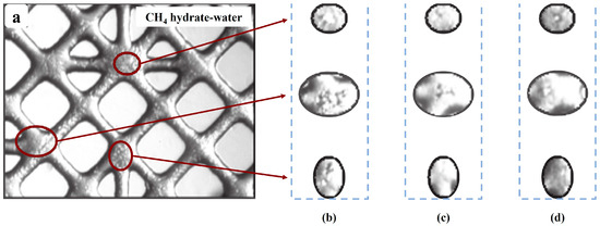 Images redrawn from Jadhawar et al. [94] for CO2 injection and the changes in CH4 hydrate morphology caused by the injection. (a) CH4 in large cages; (b) 45 h after CO2 injection; (c) 54 h after CO2 injection; (d) 89 h after CO2 injection.