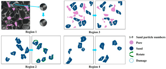 Huang et al. [95] employed microfocus computer tomography along with digital volume correlation (DVC) to study the deformation characteristics of hydrate sediment samples with replacement rates of 0%, 20.86%, 33.24% and 62.59%. Sagittal-plane CT images were utilized to illustrate the microscopic mechanism. Figure 6, modified after Huang et al. [95], illustrates the CT images of the sediment sample containing hydrate with a replacement rate of 20.86%. In this figure, four regions of the sample under various stresses are presented, with the sand particles numbered for observation. The phenomena induced by the increase in strain, such as structural damage (region 1), rotation of sand particles (region 2), the generation and compression of pores (region 3), and the movement of particles (region 4), are depicted. The results show that cement breakdown and partial pore filling are the primary reasons for plastic deformation. CO2-CH4 hydrate replacement alters the cementation structure of the hydrate sediment, resulting in the width of the shear band decreasing from 13.79 to 5.59 times the median particle size.
