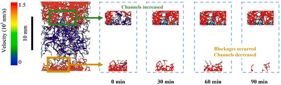 Microfocus computer tomography was used by Li et al. [96] to study the microstructure evolution of hydrate deposits during the Kr hydrate replacement by gaseous Xe at an initial hydrate saturation of 63% under a pressure of 1 MPa. It was found that temporary local enrichment of the hydrate and blockages was caused by the migration of the released water within the deposits. The flow channel distribution characterized by velocity is shown in Figure 7, modified after Li et al. [96]. The sphericity of hydrate particles was improved and pore connectivity was enhanced after the replacement. Although the existence of blockage temporarily reduced the increase in permeability, the absolute permeability was increased by 225.23%.