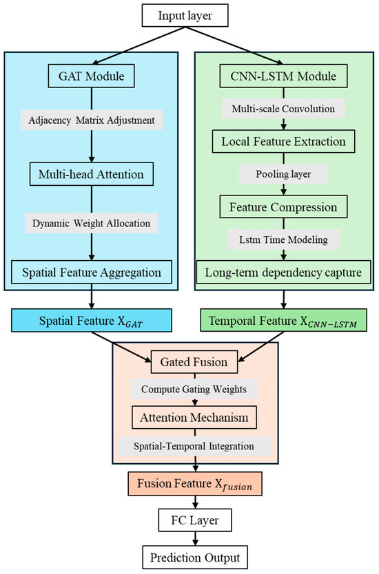 Figure 4 intuitively presents the innovative framework of the GAT-CNN-LSTM model. Unlike existing hybrid models that merely stack multiple sub-modules, this architecture introduces a gated fusion module as the core of feature integration, enabling adaptive weight allocation between spatial features from GAT and temporal features from CNN-LSTM. This design not only overcomes the limitations of static spatial modeling in traditional GCN-based methods but also solves the problem of unbalanced feature importance in conventional CNN-LSTM combinations, fully embodying the study’s novelty in spatio-temporal feature fusion.