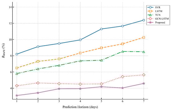 Figure 5 presents the performance comparison of five forecasting models (SVR, LSTM, TCN, GCN-LSTM, and Proposed) in terms of RMSE (Root Mean Squared Error, MW) for short-term power load prediction across 1–7 day horizons. The results demonstrate an increasing RMSE trend for all models as the prediction horizon extends, with SVR exhibiting the highest RMSE values across all horizons (reaching ≈550 MW at 7-day horizon) while the proposed method consistently achieves the lowest RMSE (only ≈200 MW at 7-day horizon), outperforming the runner-up model GCN-LSTM by over 30% error reduction and particularly demonstrating superior accuracy and stability in the 4–7 day horizon range.