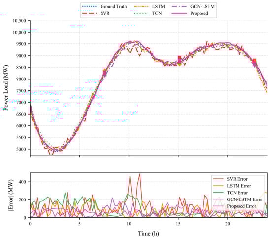 Figure 8 presents a comparative analysis of five methods for short-term power load forecasting. The upper subplot displays the predicted power load (MW) curves over a 24 h period, including Ground Truth, LSTM, GCN-LSTM, SVR, TCN, and the Proposed method. Experimental results demonstrate that the Proposed method (purple solid line) consistently exhibits the closest alignment with Ground Truth (blue dashed line), particularly during peak-load periods (e.g., 18:00–21:00). The lower subplot quantifies the absolute prediction errors (|Error| in MW), revealing that the Proposed method maintains the lowest error level (average ≈ 42.5 MW)—substantially outperforming other methods (SVR: 210.5 MW, TCN: 135.2 MW). This performance advantage is most pronounced during high-load-variability intervals, confirming the superior accuracy and stability of the proposed approach in complex power grid scenarios.