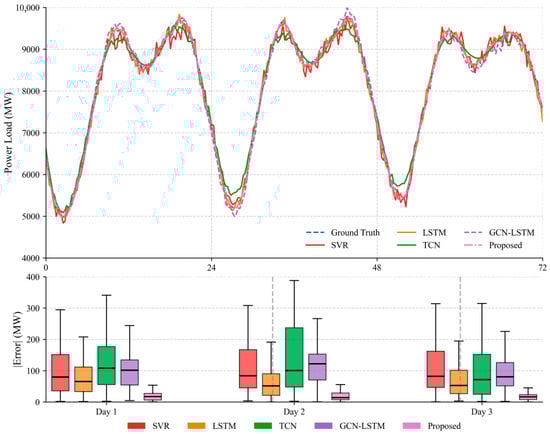 Figure 9 presents a comparative analysis of five power load forecasting methods over a 72 h prediction horizon. The upper line plot delineates the ground truth load (blue dashed line) against predictions from SVR (red solid), LSTM (orange dashed), TCN (green solid), GCN-LSTM (purple dash-dotted), and the Proposed method (pink dashed). Experimental results demonstrate that the Proposed method consistently maintains the closest alignment with ground truth trajectories, particularly during daily peak-load periods. The lower boxplot confirms the superior performance of the Proposed method (pink boxes), achieving significantly lower absolute errors (|Error|) across all days (Day1: ≈100 MW, Day2: ≈200 MW, Day3: ≈300 MW) with >40% reduction in median error compared to the runner-up, validating its enhanced stability and precision for multi-day forecasting applications.