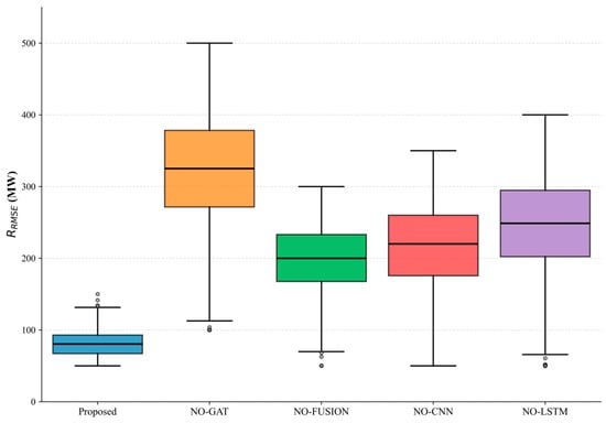 The ablation study quantifies the contributions of key components in our proposed framework through rigorous evaluation of in megawatts (MW). As shown in Figure 10, the complete Proposed model achieves the optimal performance with the lowest median (117.5 MW) and the most compact interquartile range, demonstrating robust prediction stability. Removal of the Graph Attention Network (NO-GAT variant) causes the most significant degradation, increasing the median by 258% to 421.0 MW with substantially wider error distribution. This confirms the critical role of spatial dependency modeling in power load forecasting. The NO-FUSION (297.9 MW), NO-CNN (275.2 MW), and NO-LSTM (319.8 MW) variants similarly exhibit 136–259% higher median errors than the full model, highlighting the following: