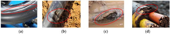 Four Representative Types of Cable Defects. The contents of the red circles correspond to the emphasized annotations for the following situations: (a) scratches (b) mechanical indentations (c) water intrusion (d) chemical corrosion.