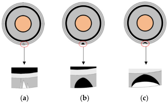 The cable consists of seven layers with varying materials and thicknesses, as shown in the table. From the innermost to the outermost, the structure includes: the copper conductor (external diameter of 30 mm), conductive shielding layer (thickness of 1.5 mm, external diameter of 33.4 mm), XLPE insulation layer (thickness of 16.5 mm, external diameter of 66.8 mm), insulation shielding layer (thickness of 1.2 mm, external diameter of 70.0 mm), semiconductor resistance-water buffer layer (thickness of 4.0 mm, external diameter of 73.8 mm), corrugated aluminum sheath (thickness of 2.0 mm, external diameter of 85.8 mm), and the outer cable sheath (thickness of 4.5 mm, external diameter of 95.2 mm). This multi-layer structure is designed to provide excellent conductivity, insulation, mechanical protection, and environmental resilience. Finite element simulation software (COMSOL Multiphysics 6.3) was used to model the four aforementioned defects, as illustrated in Figure 2. In Figure 2a, a triangular scratch defect was introduced in the outer sheath, with part of the groove extending deeply to contact the armor layer, simulating an extreme case of severe sheath damage and armor exposure. In Figure 2b, an elliptical-arc–shaped corrosion defect was constructed to model the typical morphology of moisture ingress or chemical corrosion, enabling the evaluation of their effects on the protective performance of the sheath. In Figure 2c, two elliptical-arc structures were modeled at an indentation site, where the white region indicates the air gap formed by compression, and the black region denotes the area of altered material properties, thereby reflecting the internal structural changes and performance degradation of the sheath under mechanical stress.