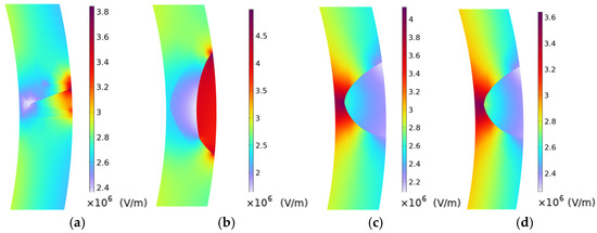 Electric Field Simulation Results of Four Defects. (a) Scratch (b) Mechanical indentation (c) Moisture ingress (d) Chemical corrosion.