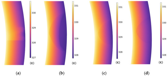 Figure 4 illustrates the temperature field distribution under the four typical defect scenarios. The simulation results reveal that all defects influence the temperature distribution within and near the defect regions; however, the overall magnitude of temperature variation remains relatively small. Scratch defects produce slight thermal perturbations at the defect tips, manifesting as a minor local temperature decrease. Indentation defects generate relatively lower temperature zones in the concave regions, while the temperature distribution along the edges shows little difference from the surrounding areas. Moisture-induced defects, due to changes in thermal conductivity, cause temperature reduction within the moisture-affected region, with high–low temperature interfaces coinciding with the moisture boundaries. Chemical corrosion defects exhibit a mild cooling trend inside the corroded regions, accompanied by smoother temperature gradients along the corrosion edges. Overall, temperature field variations under different defect conditions are mainly concentrated at the interfaces between defective and intact materials, with limited temperature differences, suggesting that the sensitivity of the thermal field to local morphological and material changes is lower than that of the electric field distribution.