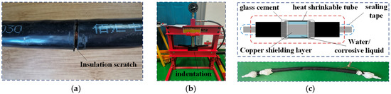 Chemical Corrosion (Type IV): This defect type simulated material degradation caused by corrosive agents (e.g., acidic, alkaline, or saline solutions) infiltrating the cable following sheath damage. The specimen length was also 1 m, with approximately 50 mm of the outer sheath removed at the midpoint to expose the metallic shield. A 600 mm heat-shrink tube was fitted, and one end shrunk. A prepared corrosive solution, made by mixing sulfuric acid (H2SO4) and nitric acid (HNO3) in a 3:1 ratio to form a simulated acid rain solution, was injected into the tube using a syringe until fully filled. The pH value of the solution was adjusted to between 4.0 and 5.0 to simulate the acidic environment., then the other end was shrunk and sealed with silicone adhesive. Both ends were fully wrapped with sealing tape to avoid external environmental interference. To distinguish corrosion severity, retention times were set to 5 days (slight), 10 days (moderate), and 15 days (severe). A representative specimen is also shown in Figure 5c.