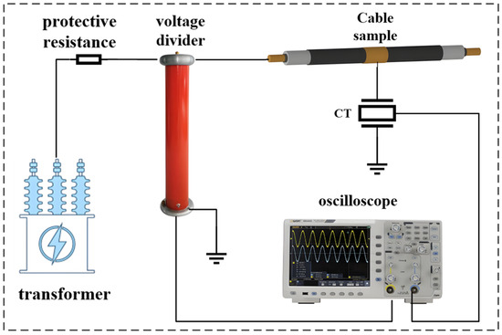 Figure 6 illustrates the experimental platform, consisting of a power-frequency corona-free test transformer, protective resistor, capacitive voltage divider, test cable, precision current transformer (CT, 50–2000 Hz), and high-resolution oscilloscope. The transformer provides a stable high-voltage source, while a 1 MΩ protective resistor is connected in series on the high-voltage side to suppress transient overcurrents during faults. The capacitive voltage divider attenuates the high-voltage signal before transmission to the measurement terminal, ensuring safe and accurate voltage acquisition. The test cable, connected to the high-voltage output, serves as the specimen. A precision current transformer, installed in the grounding loop, collects leakage current signals. Current probes, used to measure leakage currents, were positioned away from the cable’s electromagnetic field to minimize interference, and electromagnetic shielding was applied to prevent distortion. The high-resolution oscilloscope synchronously acquires and displays voltage and current signals, enabling accurate analysis of amplitude and phase relationships. Data was collected for four typical cable defects, with 100 cycles recorded per defect at different severity levels. The sampling frequency was set to 20,000 Hz, yielding 40,000 data points per sample, ensuring detailed capture of leakage current variations for defect identification.
