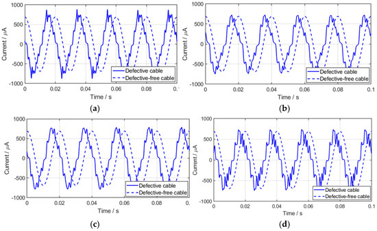 As shown in Figure 7, panels (a)–(d) correspond to the leakage current waveforms under four defect types: scratch, indentation, moisture ingress, and chemical corrosion, respectively. The dashed lines represent the leakage current results obtained from the operation of the undamaged cable, which exhibits an approximately sinusoidal profile. In contrast, when different defects are present, the leakage current waveforms display evident distortions and generate harmonic components of varying degrees. This indicates that cable defects exert a significant influence on the time-domain characteristics of leakage current, whereby the type and severity of defects alter both waveform morphology and spectral composition, establishing a close correlation between leakage current behavior and cable health condition.