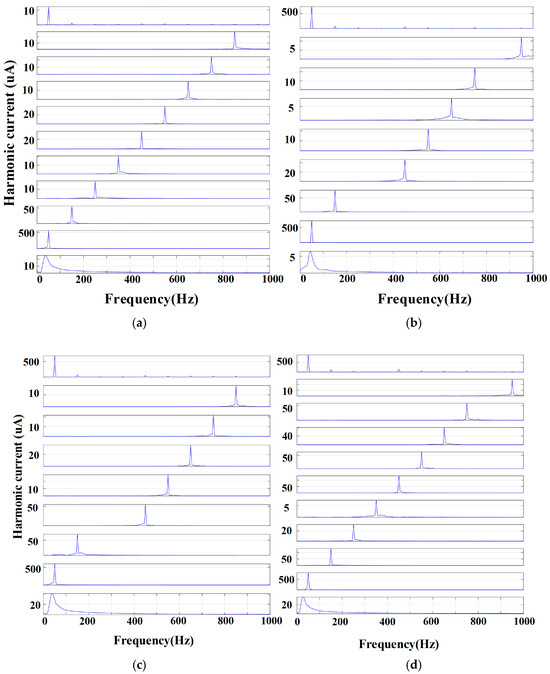 The spectrograms after WPD are presented in Figure 8, which display the spectral distributions of leakage current signals following decomposition. Through fine partitioning of both high- and low-frequency components at different decomposition levels, the fundamental frequency and its harmonics can be clearly separated across the full spectrum. As shown in panels (a)–(d), significant differences in spectral energy distribution can be observed among different frequency bands, with certain bands exhibiting distinct local peaks and concentrated energy regions. These features reflect harmonic distortions and non-stationary behaviors in the signals caused by cable defects.