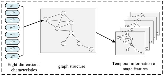 In the graph structure, the node set is denoted as , where N = 2L represents the number of sub-bands obtained under an L-level WPD decomposition. Each node corresponds to a sub-band, and its feature vector comprises the eight-dimensional features listed in Table 1, thereby forming the node feature matrix . The correlation between any two nodes i and j is quantified using the Pearson correlation coefficient: