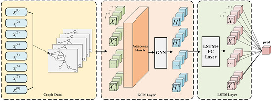 Figure 10 illustrates the data flow within the GNN-LSTM architecture. The process begins with the input of graph data, where each node’s features are fed into the Graph Convolutional Network (GCN) layer, which uses the adjacency matrix to define the relationships between the nodes. The GCN layer processes the graph data and generates hidden state representations , capturing the spatial dependencies within the graph. These hidden representations are then passed to the Long Short-Term Memory (LSTM) layer, which models the temporal dependencies by learning the sequential patterns in the data over time. Finally, the output from the LSTM layer is passed to a Fully Connected (FC) layer, which produces the final prediction, denoted as “pred”. The figure effectively demonstrates how the GNN-LSTM model learns both spatial and temporal features, starting from graph data processing with GCN to sequential learning with LSTM, ultimately generating the prediction.