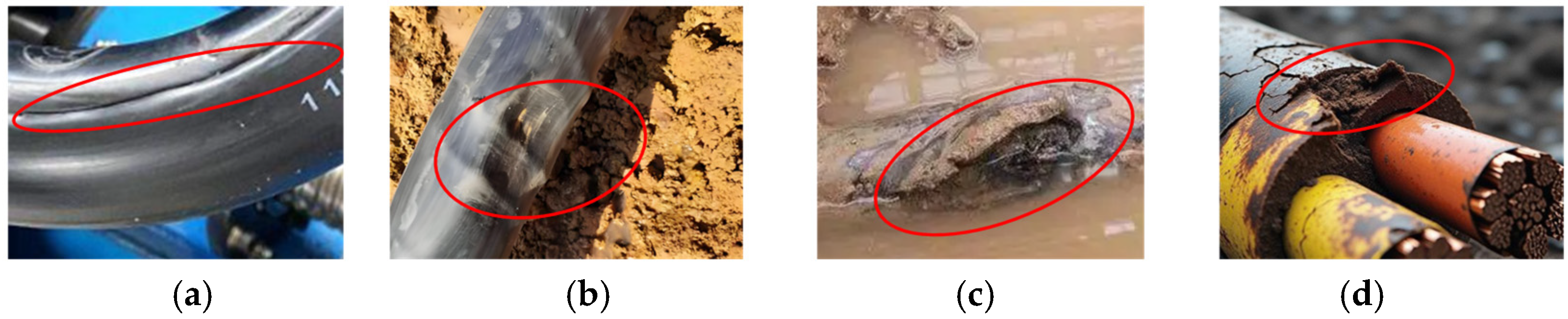 Figure 1 illustrates four typical types of cable damage caused by external factors. Scratch-type defects occur when sharp objects cause grooves in the outer sheath, exposing the armor layer, which alters the electric field, accelerates insulation aging, and increases partial discharge risks. Indentation-type defects result from heavy loading or improper installation, causing permanent plastic deformation, stress concentration, and reduced bending tolerance and current-carrying capacity. Moisture-induced defects occur in high-humidity or submerged environments, where water penetrates micro-pores in the sheath, increasing conductivity and dielectric loss, thus shortening the cable’s lifespan. Chemical corrosion defects arise from corrosive agents infiltrating the sheath, causing polymer degradation and corrosion patches, which weaken the mechanical protection and waterproofing of the sheath, threatening the integrity of the metallic shielding and conductor [