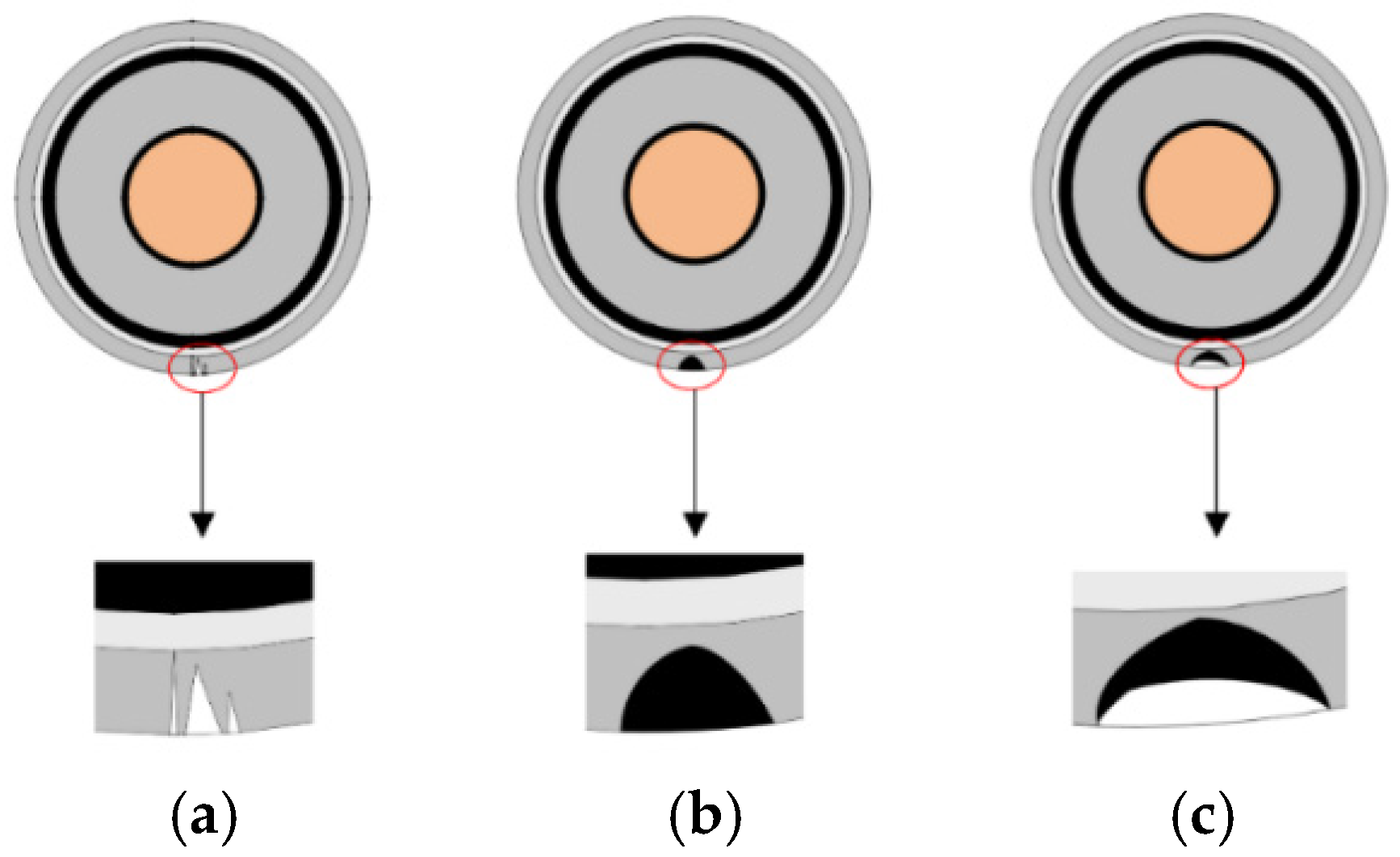 The cable consists of seven layers with varying materials and thicknesses, as shown in the table. From the innermost to the outermost, the structure includes: the copper conductor (external diameter of 30 mm), conductive shielding layer (thickness of 1.5 mm, external diameter of 33.4 mm), XLPE insulation layer (thickness of 16.5 mm, external diameter of 66.8 mm), insulation shielding layer (thickness of 1.2 mm, external diameter of 70.0 mm), semiconductor resistance-water buffer layer (thickness of 4.0 mm, external diameter of 73.8 mm), corrugated aluminum sheath (thickness of 2.0 mm, external diameter of 85.8 mm), and the outer cable sheath (thickness of 4.5 mm, external diameter of 95.2 mm). This multi-layer structure is designed to provide excellent conductivity, insulation, mechanical protection, and environmental resilience. Finite element simulation software (COMSOL Multiphysics 6.3) was used to model the four aforementioned defects, as illustrated in