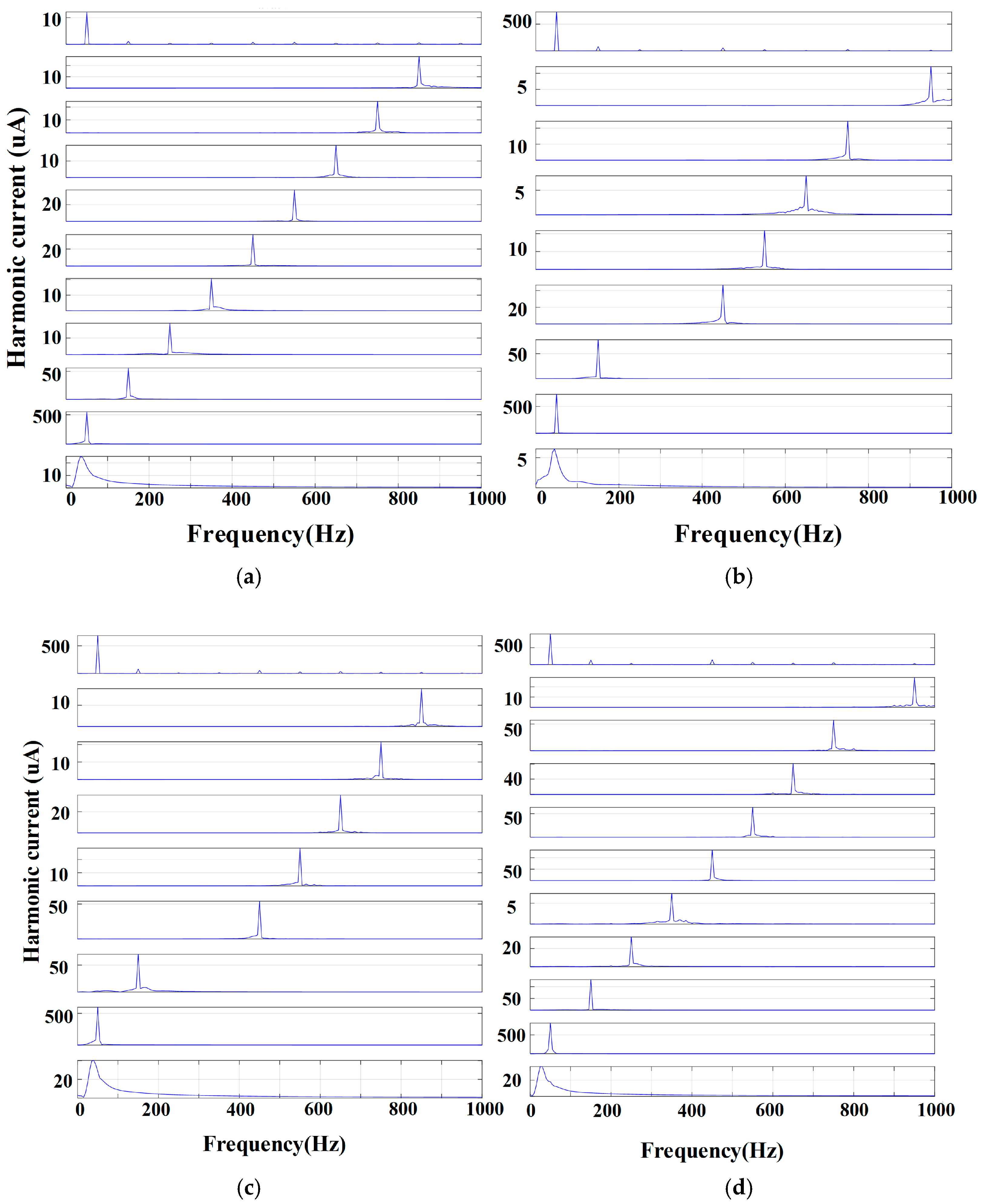 Figure 8, which display the spectral distributions of leakage current signals following decomposition. Through fine partitioning of both high- and low-frequency components at different decomposition levels, the fundamental frequency and its harmonics can be clearly separated across the full spectrum. As shown in panels (a)–(d), significant differences in spectral energy distribution can be observed among different frequency bands, with certain bands exhibiting distinct local peaks and concentrated energy regions. These features reflect harmonic distortions and non-stationary behaviors in the signals caused by cable defects.