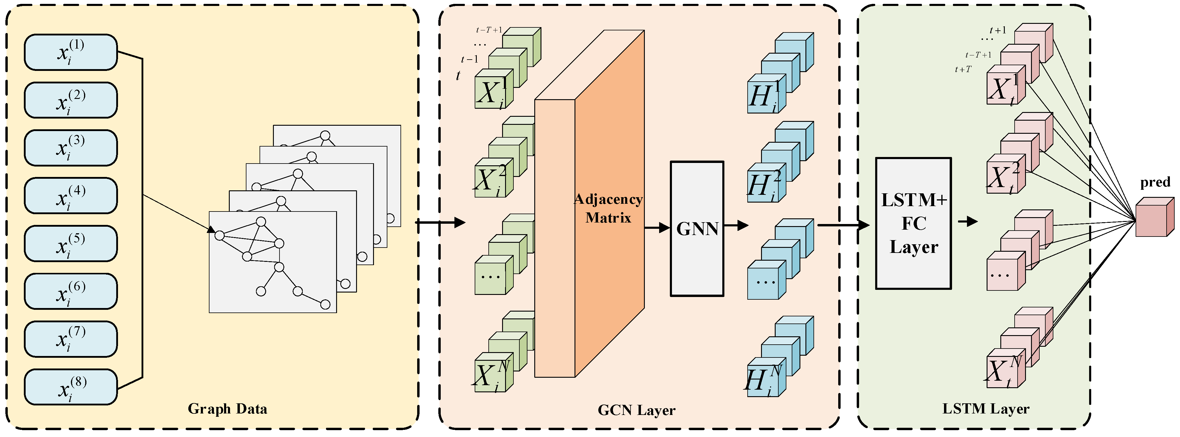, capturing the spatial dependencies within the graph. These hidden representations are then passed to the Long Short-Term Memory (LSTM) layer, which models the temporal dependencies by learning the sequential patterns in the data over time. Finally, the output from the LSTM layer is passed to a Fully Connected (FC) layer, which produces the final prediction, denoted as “pred”. The figure effectively demonstrates how the GNN-LSTM model learns both spatial and temporal features, starting from graph data processing with GCN to sequential learning with LSTM, ultimately generating the prediction.