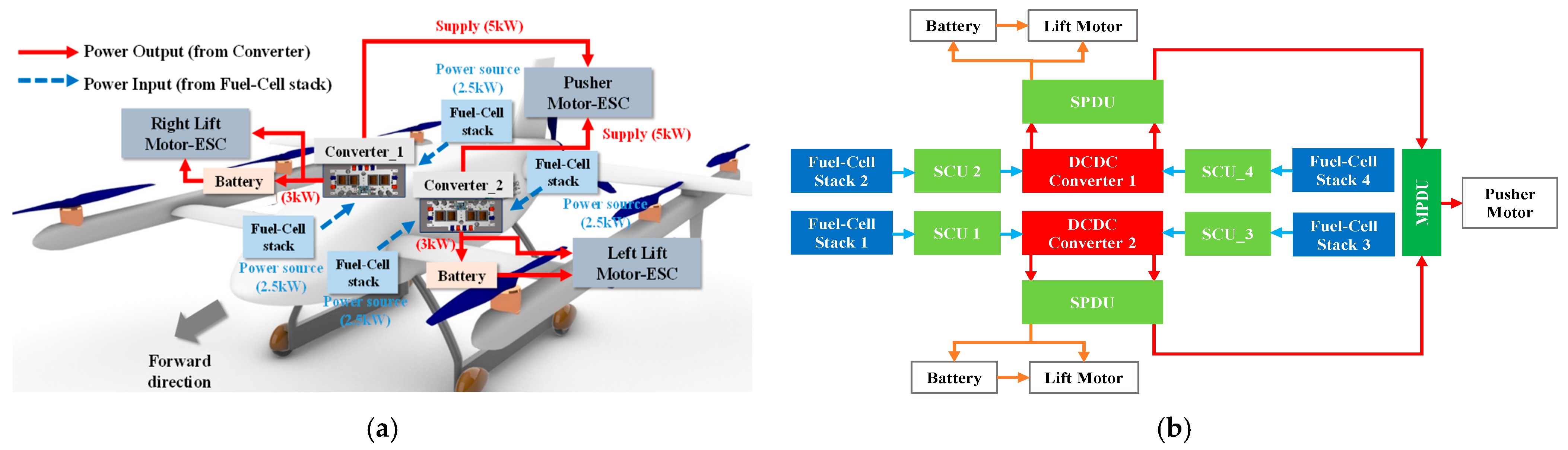 In Section 2, the specifications of the system where the proposed fuel cell DC–DC converter (FDC) is applied are described in detail, highlighting the differences from conventional powertrain systems. Section 3 explains the topology and design of the proposed FDC, along with the control algorithms and energy management functions. Section 4 presents verification of the controller and energy management functionality through simulations. Section 5 deals with ground-based experimental tests simulating the unmanned aerial vehicle on an ironbird test bed. Finally, Section 6 concludes the paper.
