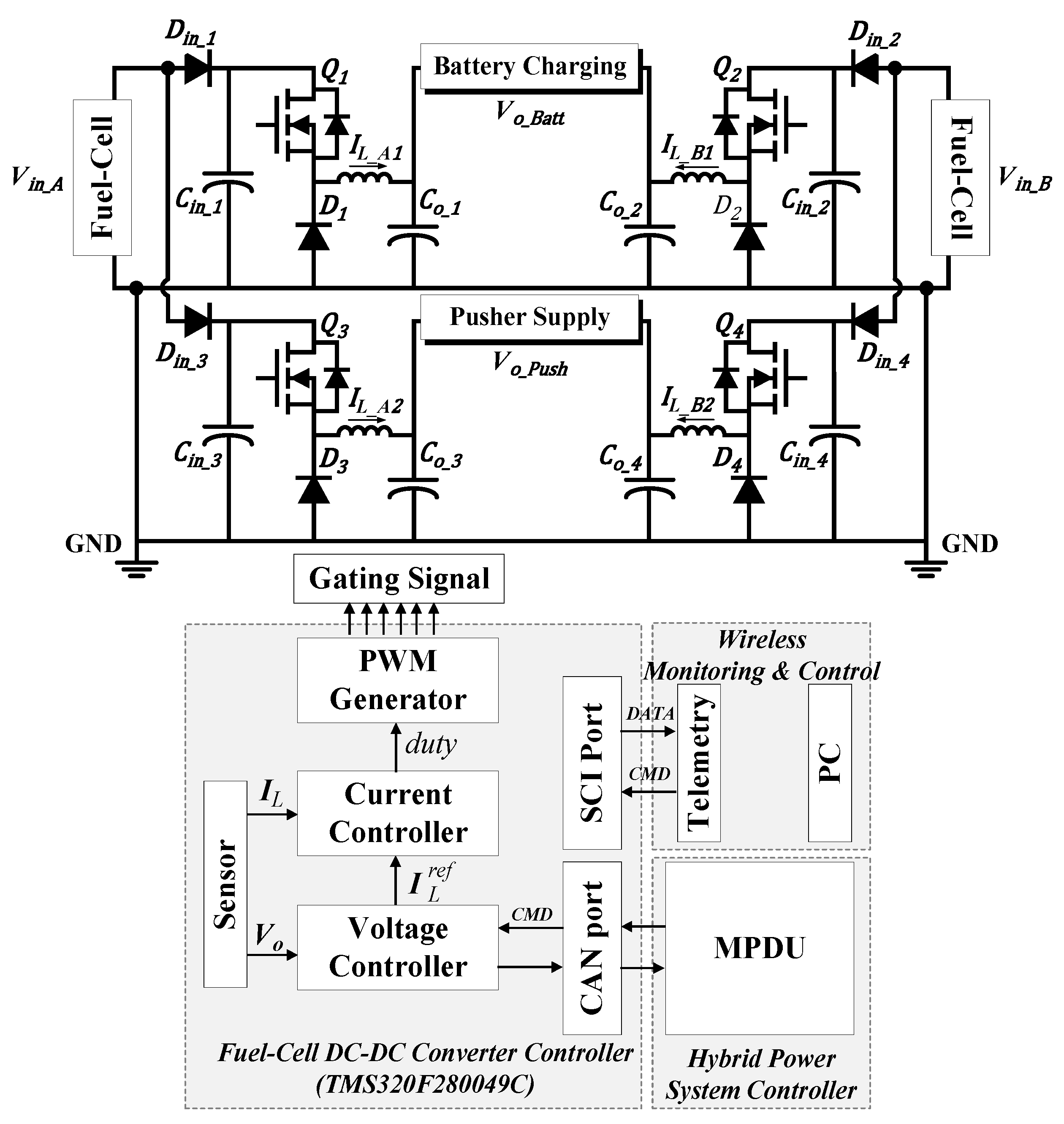 Hydrogen fuel cells are considered a highly promising power source for UAVs because of their high energy density and environmental friendliness. However, they are generally characterized by a slow dynamic response and can only generate stable power when the hydrogen supply is constant [3,4]. This limits their responsiveness to sudden load fluctuations [5], which is particularly pronounced in systems with dynamic load profiles such as VTOL UAVs and off-road tractors, and can degrade the overall propulsion performance and shorten the lifetimes of components. To address these limitations, hybrid power systems that combine fuel cells with secondary energy storage devices such as batteries or ultracapacitors have been widely adopted [6,7]. Common topologies include single-stage, dual-stage series, and dual-stage parallel architectures [8,9], which differ in terms of system efficiency, component count, output voltage control performance, battery specification requirements, peak power handling capability, ease of control, and responsiveness to variable loads [10,11]. These considerations have driven research into energy management strategies that optimize power allocation based on the specific roles and characteristics of each power source [12,13,14]. In a hybrid power system, each power source typically operates at a different voltage level, and the output voltage can vary significantly depending on the load condition. As a result, the integration of a DC–DC converter capable of both voltage regulation and power control is essential for achieving stable and efficient operation. In addition, single-stack fuel cell systems have limited output capacity and reliability, which has led to the rise of multi-stack fuel cell systems owing to their potential scalability and fault tolerance. However, such systems frequently encounter issues such as voltage imbalance between stacks, which complicates power distribution and load sharing [15]. In powertrain systems for vehicles and ships where weight and space constraints are relatively relaxed, multi-stack fuel cell systems typically employ individual DC-DC converters for each stack. Due to the relatively loose constraints on the weight and size of components, a higher-level controller responsible for energy management and power distribution is additionally configured, enabling relatively easy operation of each individual converter [16,17,18]. However, in applications with stringent size and weight limitations, such as UAVs, there is a need for a lightweight and compact hydrogen fuel cell power conversion system capable of controlling multiple buck converters simultaneously through a single unified controller while performing power distribution.