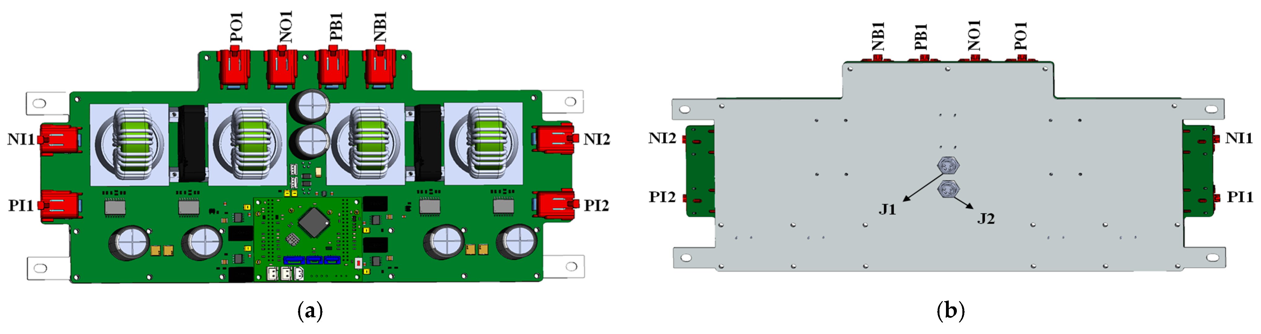 Figure 4 presents a 3D model of the FDC. Two input channels are located on either side of the FDC, and two output connectors are positioned on the top surface for optimal accessibility. The four inductors of the buck converter circuits are mounted on the top side to facilitate efficient thermal dissipation via cooling fans. Switching components and diodes are placed on the bottom side, where they can be cooled by an integrated heatsink.