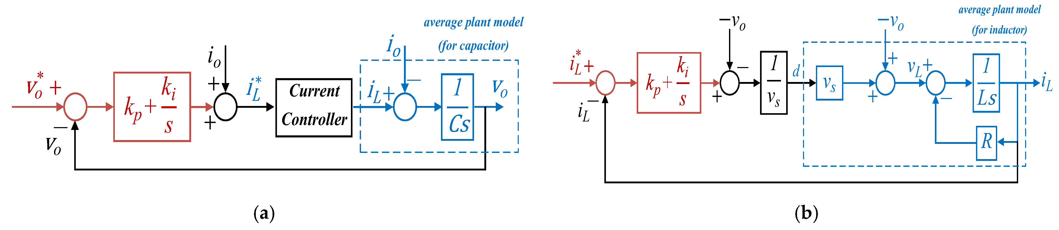 Figure 5a–c all represent control block diagrams. Figure 5a is the voltage controller, Figure 5b is the current controller, and Figure 5c is the single voltage controller with dual current controller block diagram. The dual-loop control structure in Figure 5c can be interpreted as having a master–slave architecture, as illustrated in Figure 5d, which offers the advantage of flexible scalability for future expansion of the system capacity. The transfer functions for the current control (inner loop) and voltage control (outer loop) of the FDC are derived in both the continuous-time and discrete-time domains to facilitate the design of a cascaded control system.