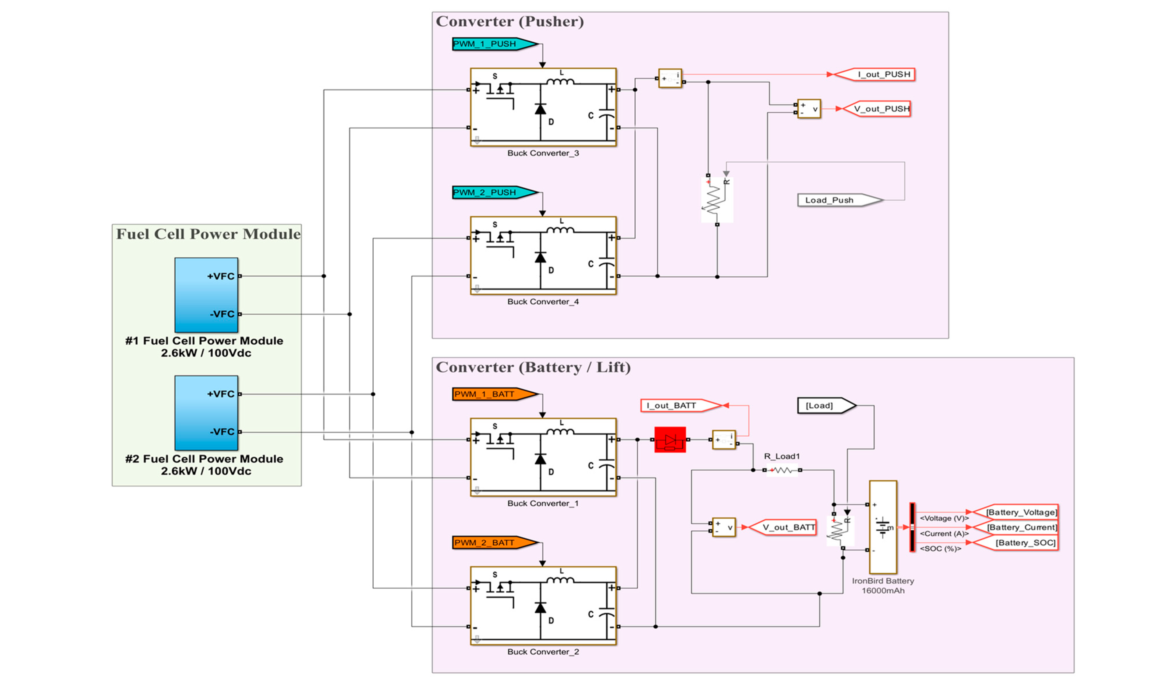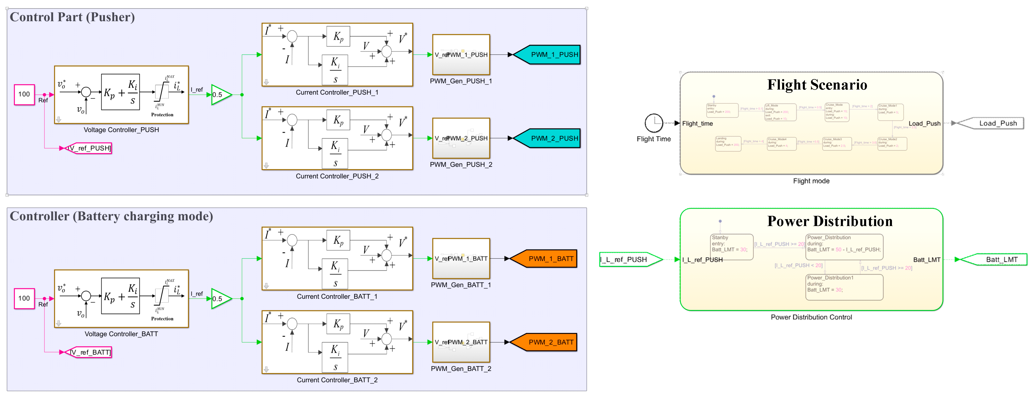 The load balancing algorithm for voltage and current control were validated through simulations using a model that matched all specifications of the actual FDC. As given in Table 1, parameters such as the rated power, input voltage, desired output voltage, sampling time, and switching frequency were selected to match the conditions of the actual hardware. Two different control schemes were compared: a single-loop scheme using only voltage control and the proposed dual-loop scheme incorporating both voltage and current control. The simulation setup was constructed as shown in Figure 9, utilizing battery and fuel cell models to test the proposed FDC under various flight scenarios and to evaluate the control performance under realistic operating conditions.