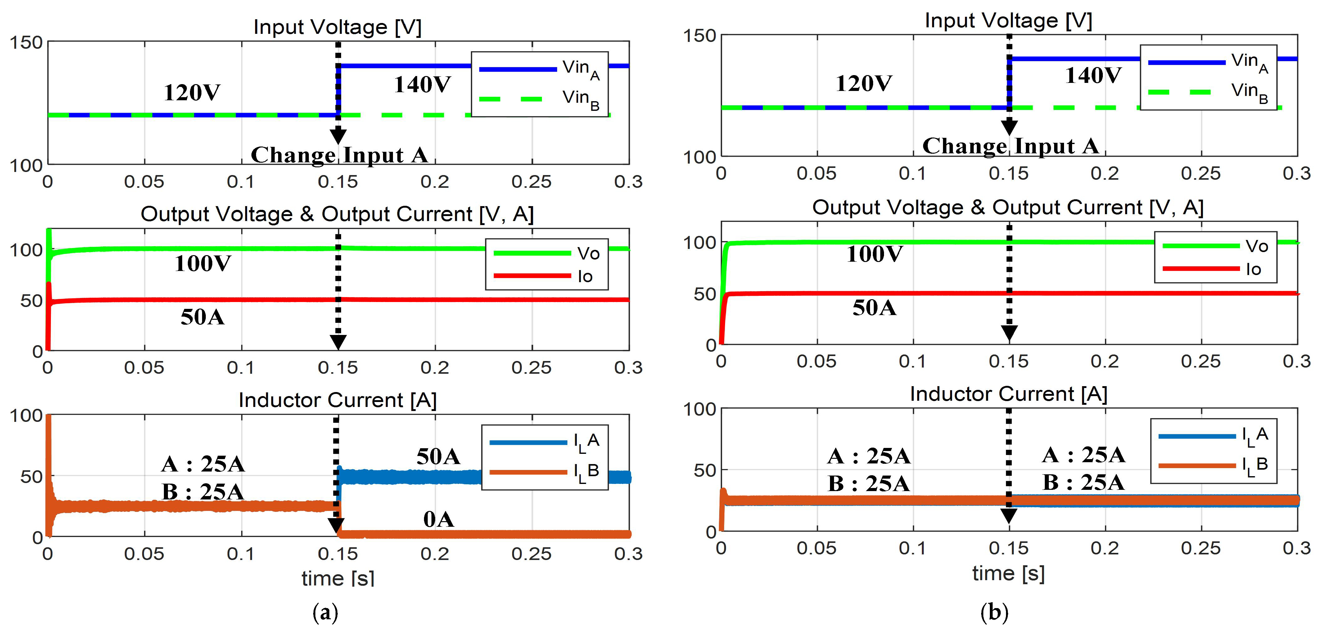In a multi-stack fuel cell system, multiple hydrogen stacks are connected as inputs to the converters. Since the voltages of these stacks are not always identical, simulations were conducted to verify whether the proposed converter maintains stable power conversion and achieves proper load balancing under such conditions. As shown in Figure 10, channels A and B were initially set to an equal input voltage of 120 V. Under these conditions, both control schemes exhibited a consistent current distribution across the two channels based on the inductor current waveforms. However, at t = 0.15 s, the input voltage of channel A was increased to 140 V to deliberately introduce a voltage imbalance. After this change, the single-loop scheme caused the current to flow predominantly through channel A, which resulted in an unequal current distribution. In contrast, the proposed dual-loop scheme maintained a uniform current contribution from both channels, which effectively ensured that each channel delivered approximately half of the total load current despite the voltage discrepancy.