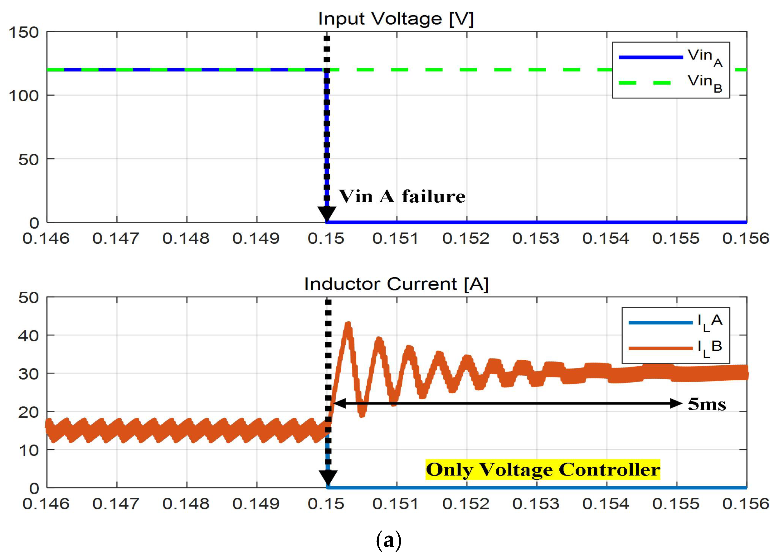 Figure 11. Input voltage failure in channel A: (a) single-loop control scheme (voltage-only); (b) dual-loop control scheme (voltage and current).