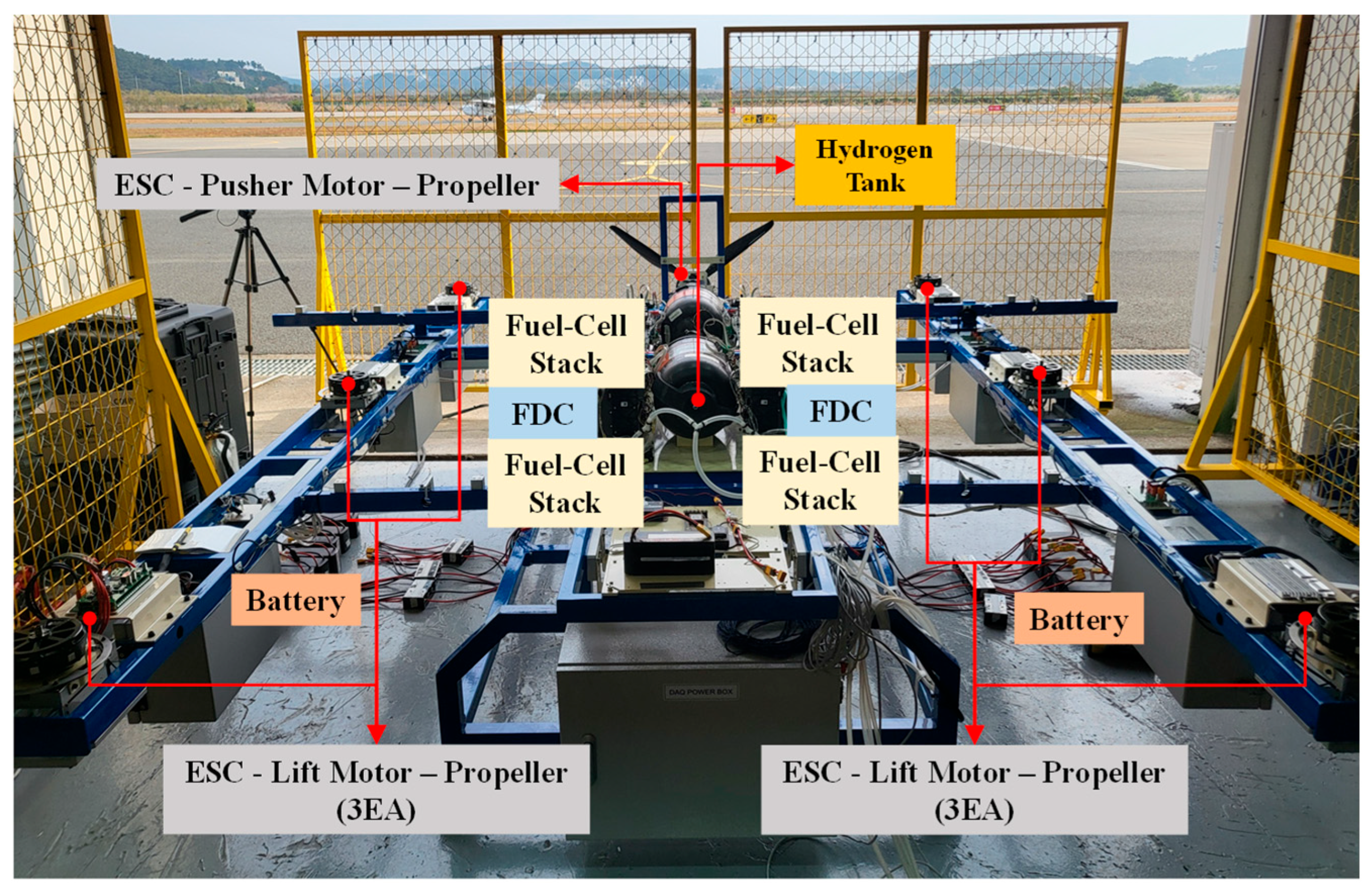 As shown in Figure 15, an iron bird testbed was utilized for ground-based experiments of the hybrid power system. The testbed was built at full scale to match the dimensions of the actual UAV, and both the propulsion system and hybrid power system were configured identically to those in the UAV. The fuel cell stacks and FDCs were positioned at the center of the airframe to facilitate power distribution to the lift and pusher motors as well as charging of the battery packs.