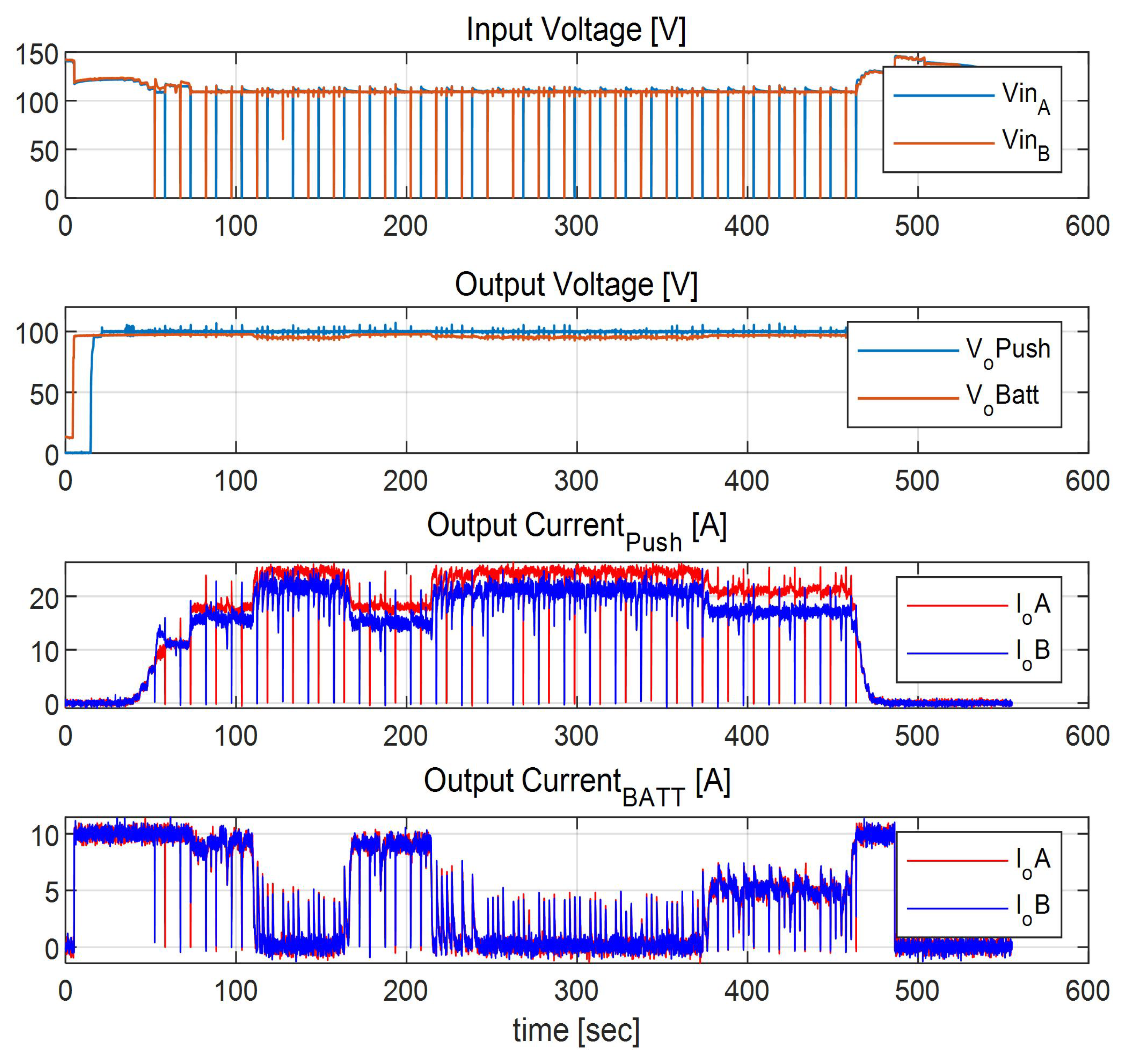Figure 16 illustrates the experimental waveforms obtained from test 1, which encompassed the full system comprising the fuel cells stacks, FDCs, motors, and inverters. The waveforms for the FDC input voltage from the fuel cell stacks, the FDC output voltage for both the pusher motor and battery charging, the output current to the pusher motor, and the battery charging current are presented. The input voltage waveform confirms that the FDC effectively regulated the input voltage from the fuel cell to maintain a stable output of approximately 100 V even as the input voltage fluctuated. The current waveforms also confirm that current was balanced well across both channels. Two hydrogen fuel cell stacks alternately experience short circuit operation causing inputs to momentarily drop close to zero; however, the single voltage controller–dual current controller maintains the targeted output of 100 Vdc through the current controller of the opposite phase. This verifies that the FDC operates suitably for multi-stack hydrogen fuel cell systems. The current waveforms in Figure 16 for the pusher motor and battery charging indicate that the FDC prioritized delivering power to the pusher motor with any surplus power being allocated to battery charging depending on the flight phase. This functionality demonstrates the energy management capability of the FDC by implementing a battery charging mode based on the power distribution algorithm, aimed at extending the actual flight time of UAVs. Figure 17 presents the experimental waveforms of the FDC subjected to sudden load changes. Regardless of the abrupt load changes, the output voltage was stably maintained at approximately 100 V throughout the test. Notably, the initial overshoot above 100 V in the output voltage to the pusher motor can be attributed to the initial no-load condition of the pusher motor (i.e., load current of 0 A). Figure 18 illustrates the efficiency of the FDC across various operating conditions. Three output modes were compared: pusher-only output, battery-only output, and simultaneous dual output. The efficiency was evaluated over a power range of 0.5–5 kW. Although the efficiency slightly decreases at output levels below the rated operating point, the system maintains a certain level of efficiency under actual operating conditions. It was also confirmed that simultaneous operation of two output channels is possible without significant efficiency degradation.