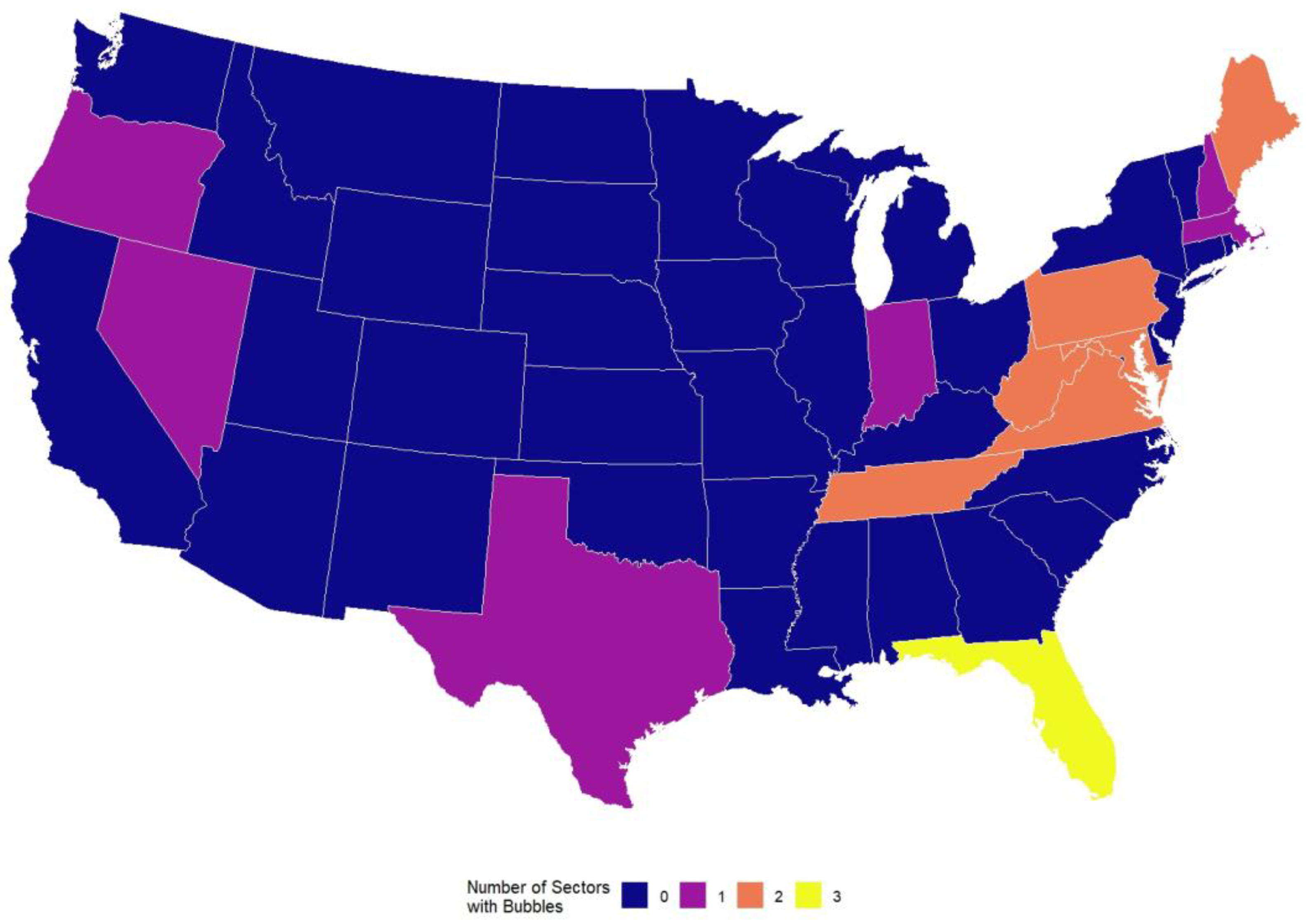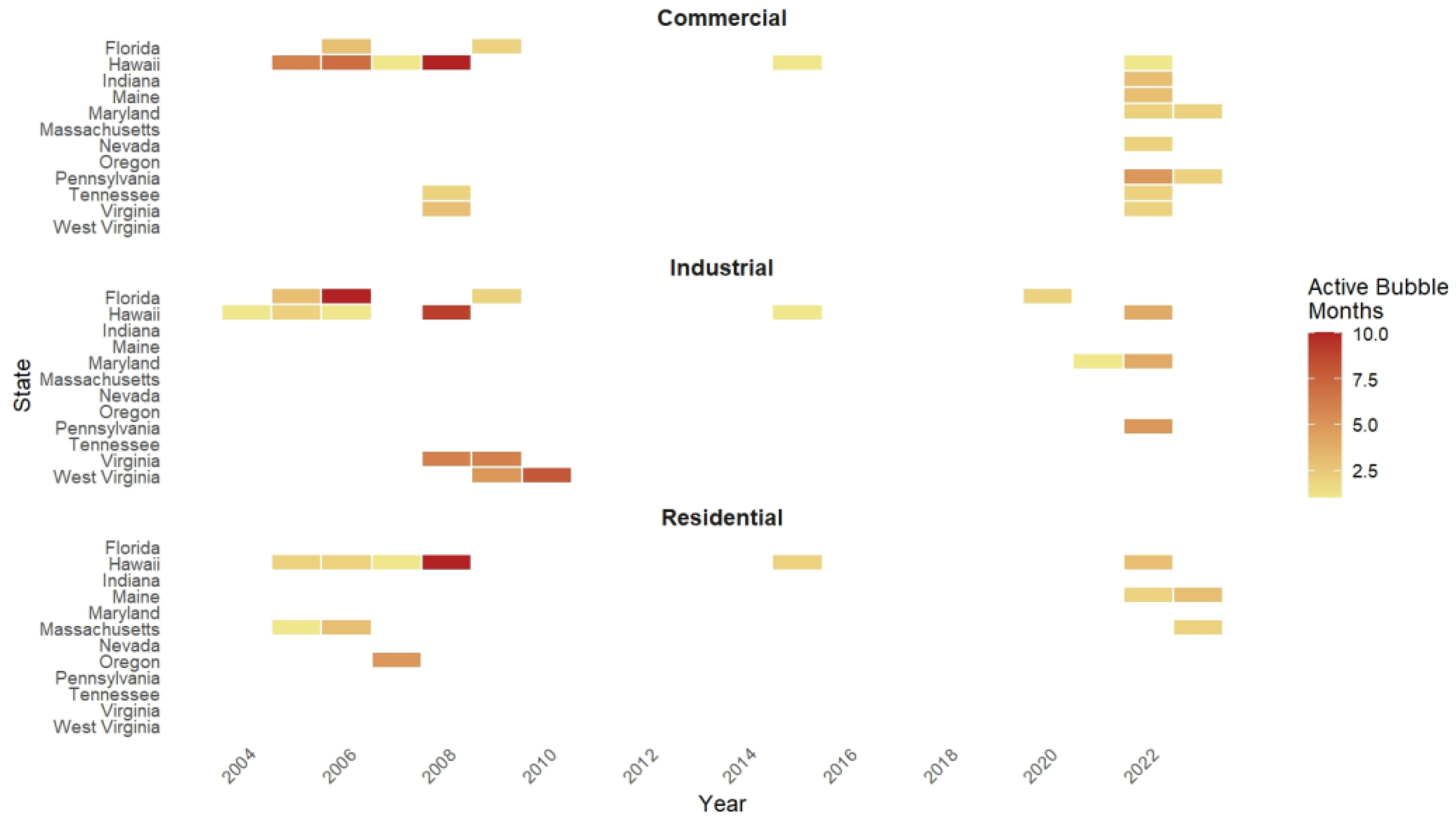 Interestingly, states such as Massachusetts and Oregon exhibited residential-sector-specific bubbles, suggesting consumer-facing vulnerabilities possibly linked to regulatory, seasonal fuel price impacts, or broader socio-economic disruptions. Such findings are reinforced by [