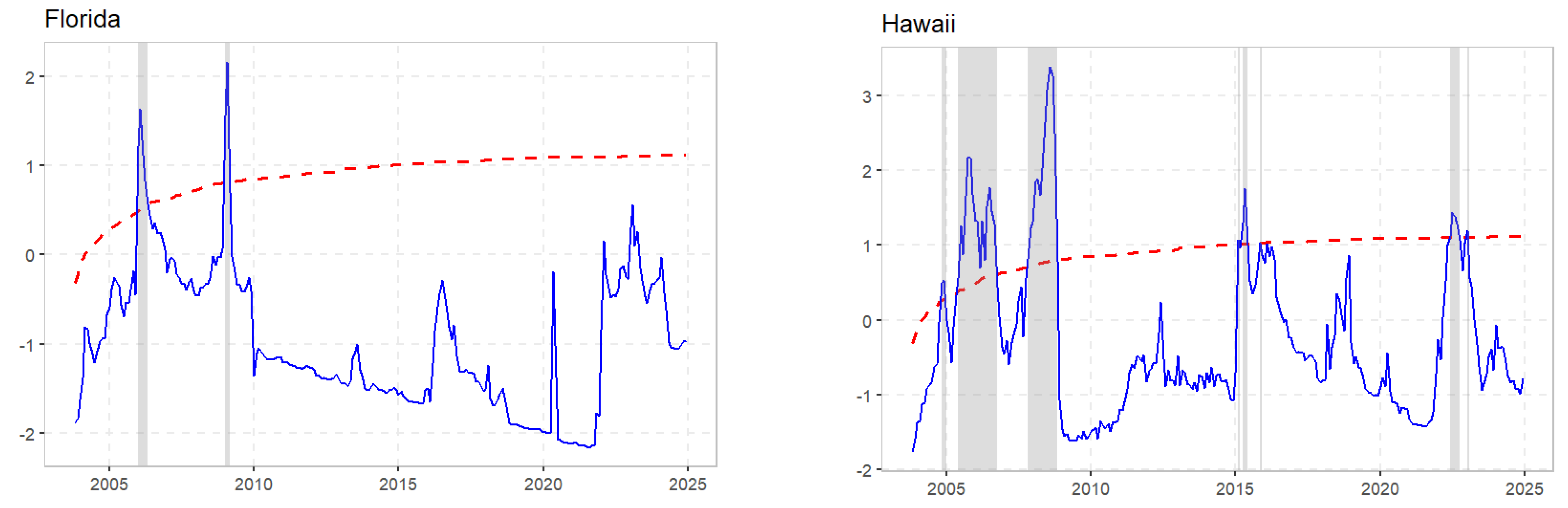 Table 3 shows that the vast majority of these episodes were characterized by a “positive” signal, indicative of periods where prices significantly exceeded fundamental values before correcting. Hawaii exhibited the highest frequency of such positive bubbles, with six distinct occurrences between 2005 and 2022. These Hawaiian bubbles varied considerably in duration, from very brief one-month events (e.g., April 2006, May 2015, July 2022) to a protracted 11-month bubble spanning from December 2007 to November 2008. The frequent and sometimes prolonged bubbles in Hawaii’s commercial sector likely reflect its heavy dependence on imported oil for electricity generation, making it highly susceptible to global oil price shocks [