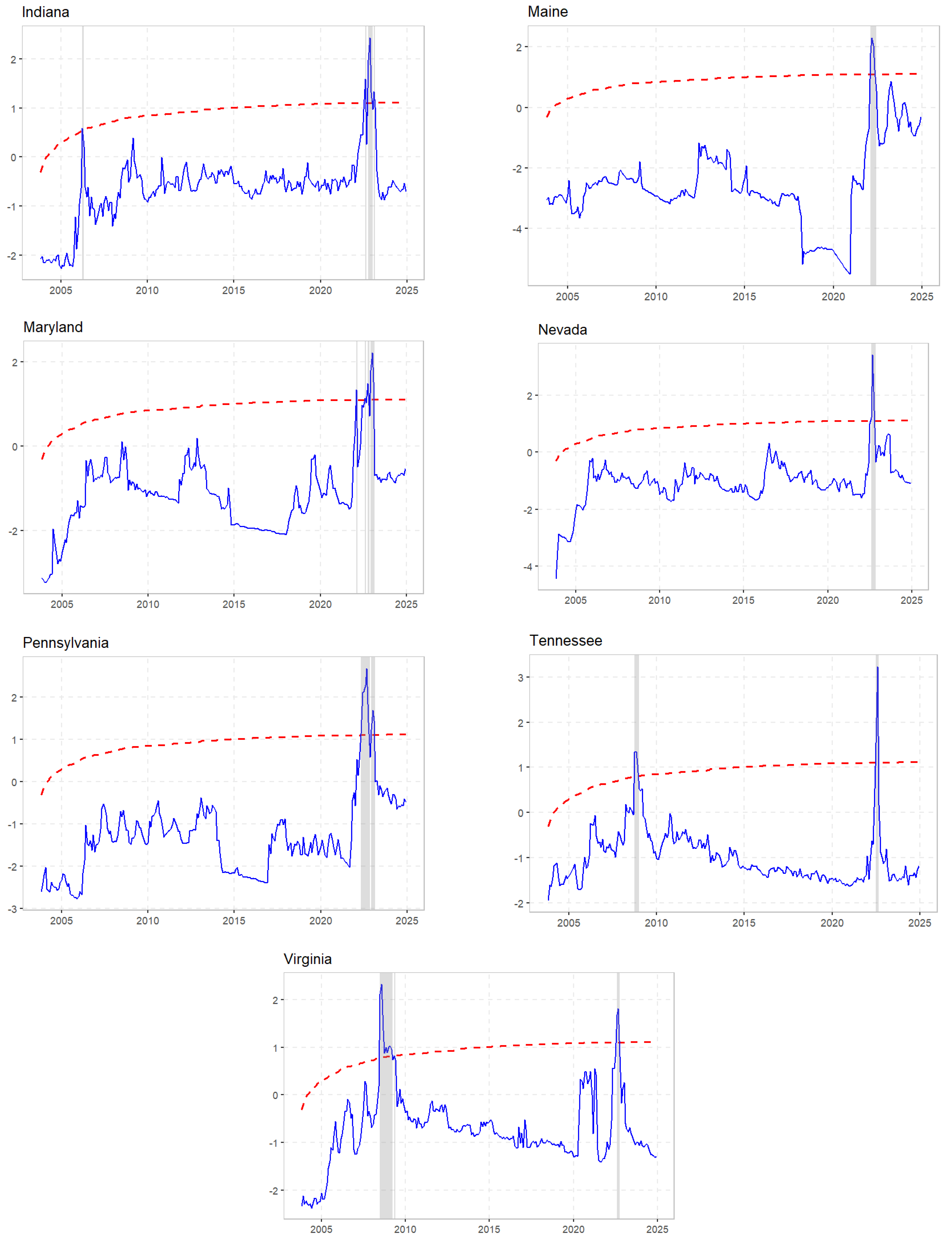 In contrast, Florida experienced two shorter positive bubbles, one lasting three months in early 2006 and another for two months in early 2009. These may correlate with periods of natural gas price volatility or hurricane-related supply disruptions, given Florida’s energy profile. Several other states, including Maine, Maryland, Nevada, Pennsylvania, Tennessee, and Virginia, predominantly saw positive bubble activity clustered in 2022 and extending into early 2023. For instance, Pennsylvania experienced a notable five-month positive bubble from June to November 2022, followed by a shorter two-month event in early 2023. Maryland also had two positive bubbles in late 2022 and early 2023, lasting one and three months, respectively. Similarly, Tennessee and Virginia each had an earlier bubble in 2008 and a more recent one in 2022, all positive and lasting two to three months. The clustering in 2022–2023 aligns with global energy market disruptions following the pandemic and geopolitical events influencing fuel prices.