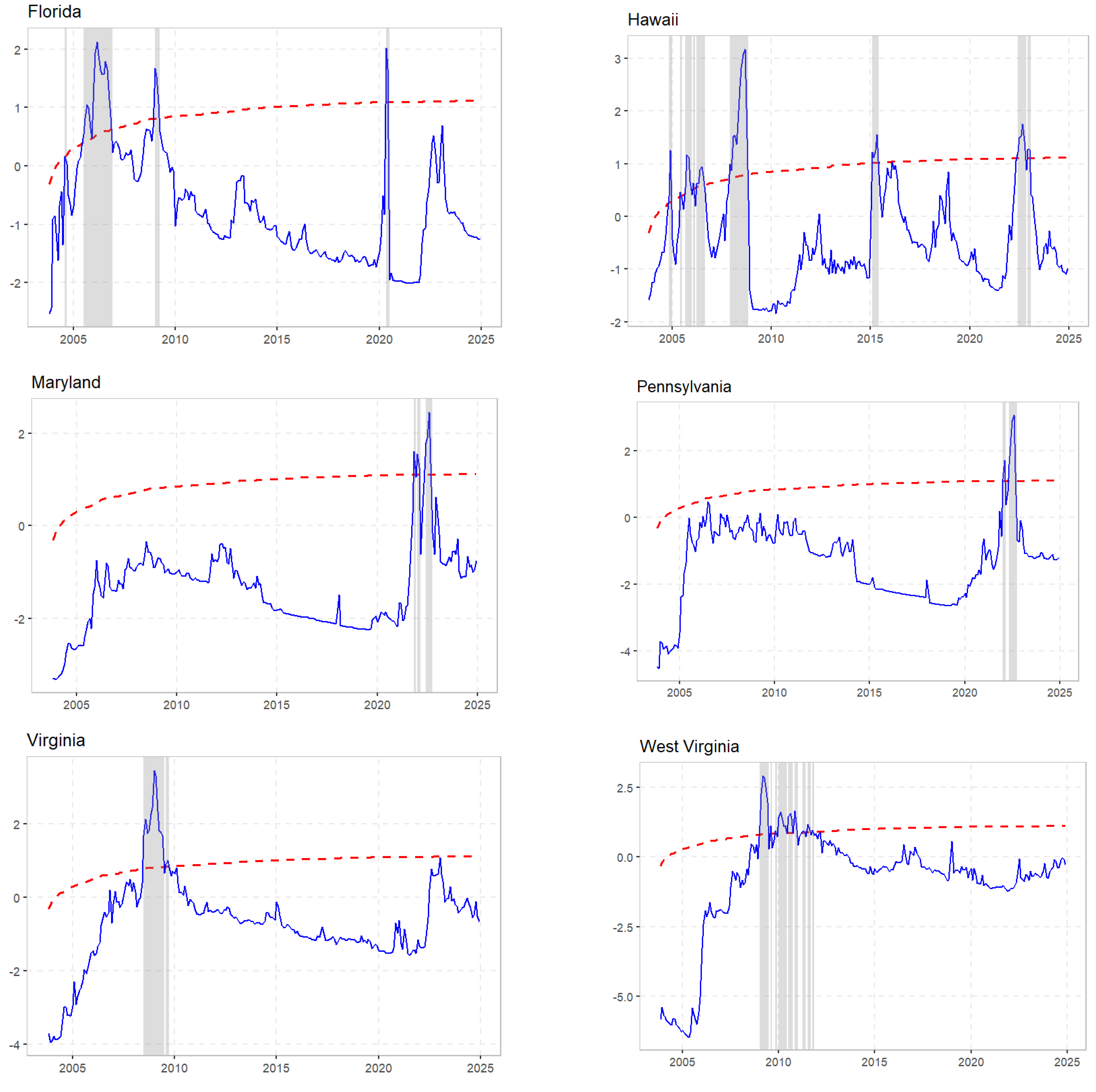 Table 4 delineates a consistent finding across all listed states—Florida, Hawaii, Maryland, Pennsylvania, Virginia, and West Virginia—in that all identified bubbles were characterized by a “positive” signal, indicating periods where prices significantly exceeded their fundamental values, and none of these bubbles were ongoing at the time of data collection.