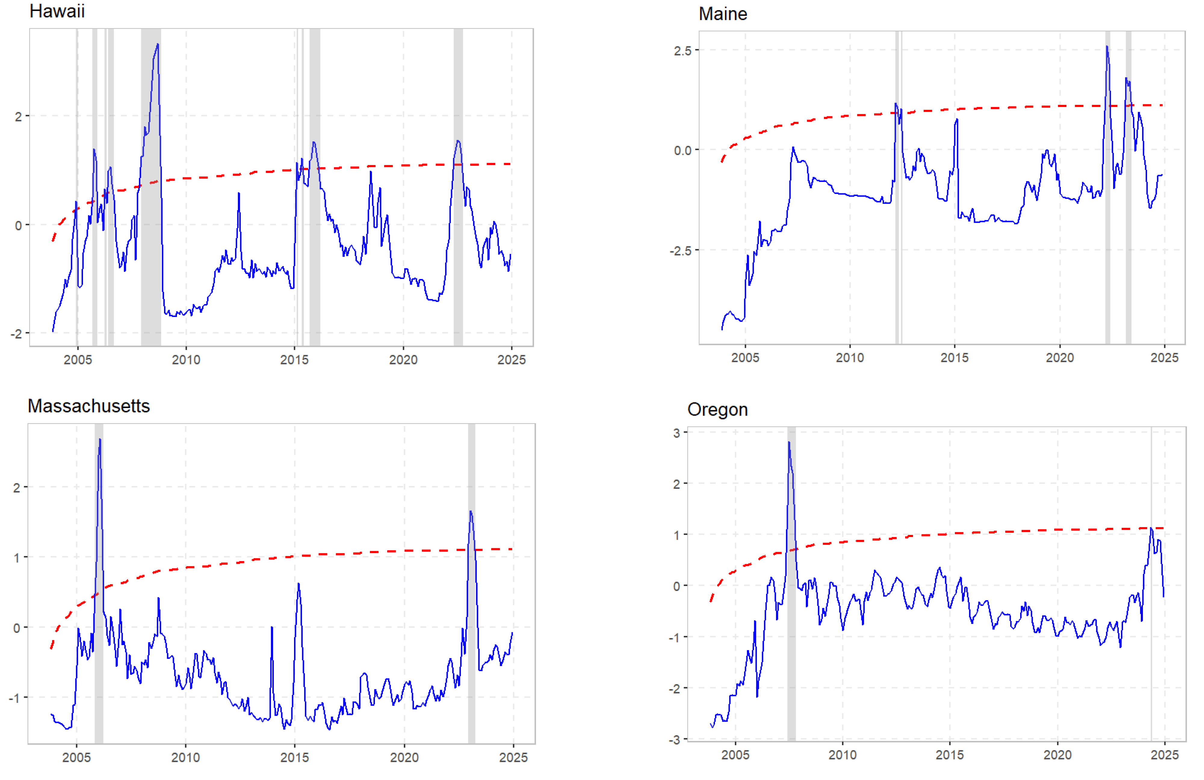In contrast, Maine and Massachusetts each experienced two positive bubble periods. Maine’s bubbles were relatively recent (2022 and 2023), possibly linked to wholesale market price spikes in New England affecting standard offer service rates, which are a common way residential customers receive electricity if not choosing a competitive supplier. Massachusetts saw an earlier four-month bubble (2005–2006) and a more contemporary two-month bubble in early 2023, similarly reflecting regional market conditions and fuel price volatility. Oregon registered only a single positive bubble in this dataset, which persisted for five months in 2007. This could be related to hydro conditions (a significant part of Oregon’s energy mix) or natural gas price movements during that specific period [