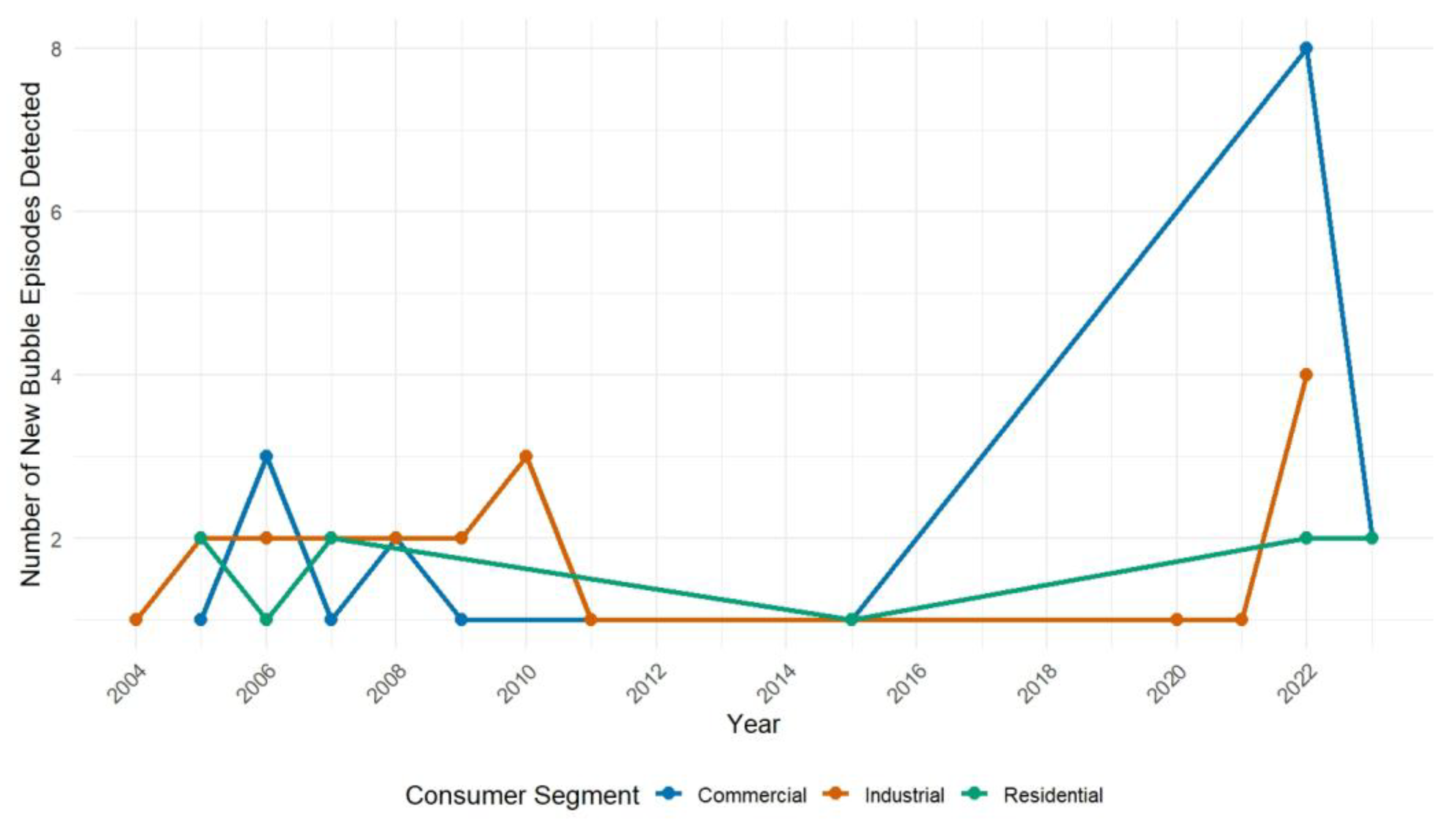 The detection of positive speculative bubbles across all consumer segments (Commercial, Industrial, and Residential), as summarized in