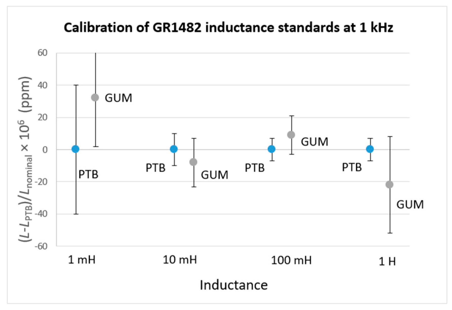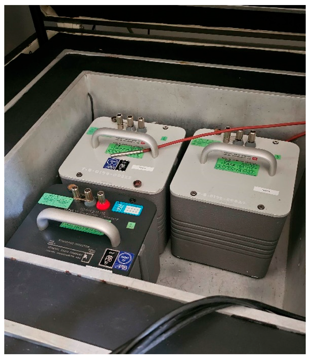 - Dierikx, E.; Melcher, J.; Callegaro, L. Final report on the supplementary comparison EURAMET.EMS26: Inductance measurements of 100 mH at 1 kHz (EURAMET project 816). Metrologia 2012, 49, 01002. [Google Scholar] [CrossRef]