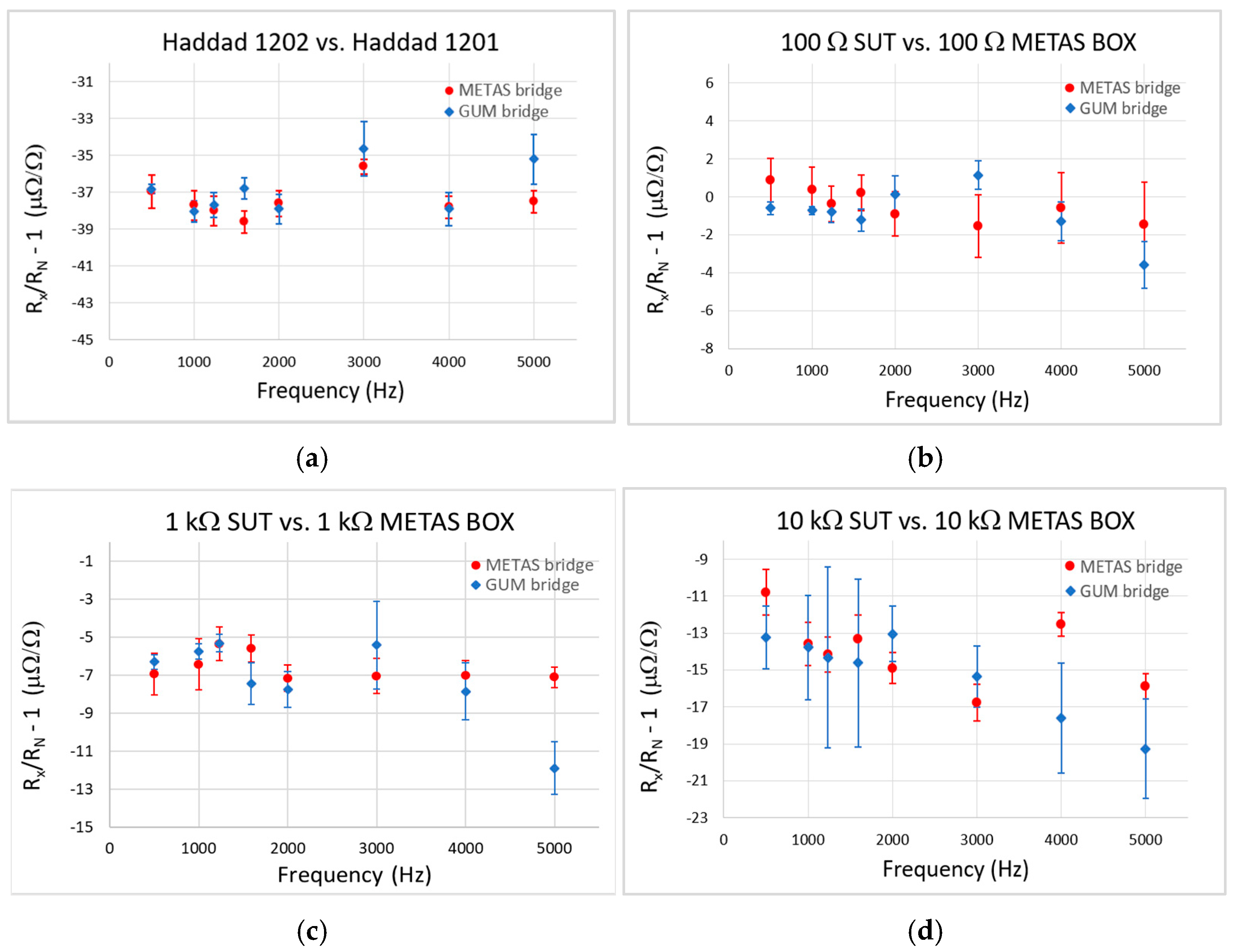 - Calibration of three SUT Vishay HZ-foil resistors (100 Ω, 1 kΩ, 10 kΩ) by comparing them with the reference METAS “R” box at frequencies of 500 Hz, 1000 Hz, 1233 Hz, 1592 Hz, 2 kHz, 3 kHz, 4 kHz, and 5 kHz.