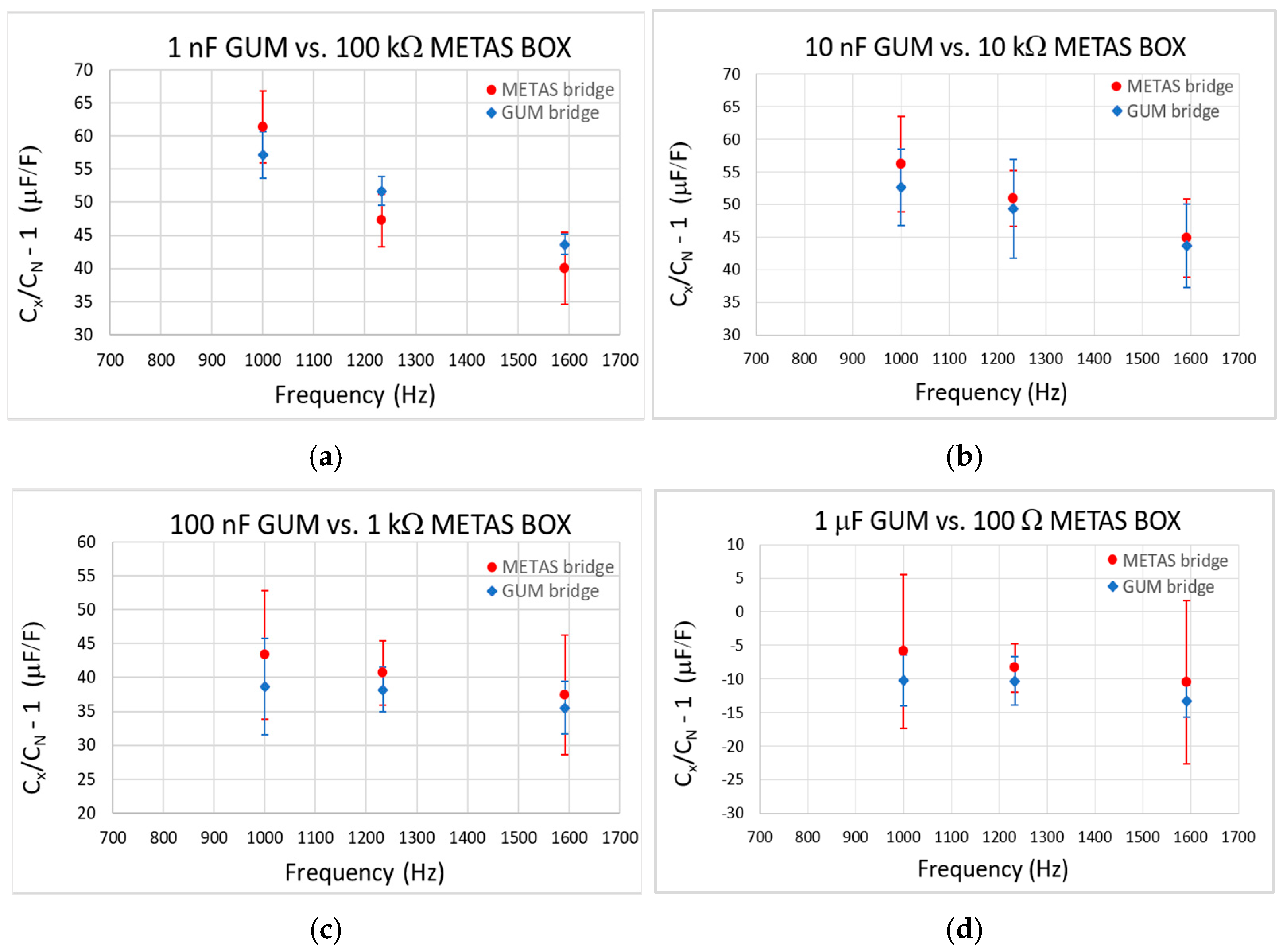 - Kim, D.B.; Kim, W.-S. Performance Study of a Digital Impedance Bridge on the basis of Capacitance Measurements in Audio Frequency. In Proceedings of the 2020 Conference on Precision Electromagnetic Measurements (CPEM), Denver, CO, USA, 24–28 August 2020; pp. 1–2. [Google Scholar]