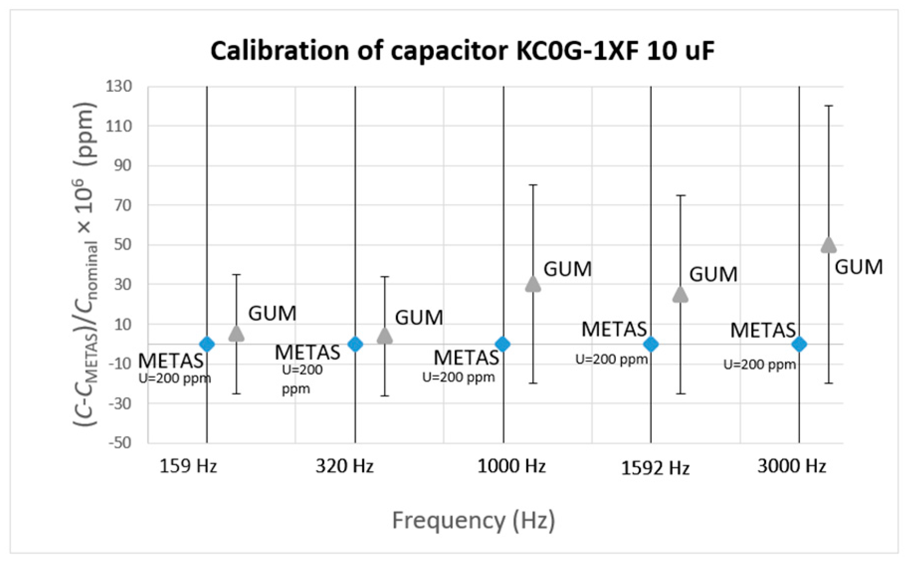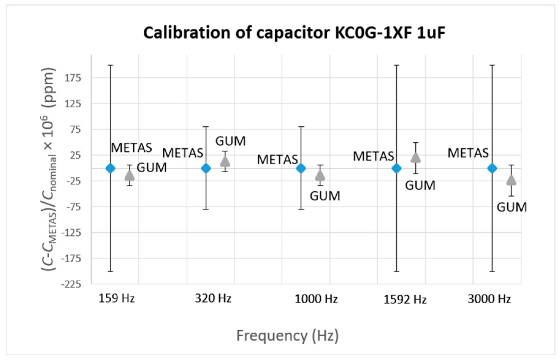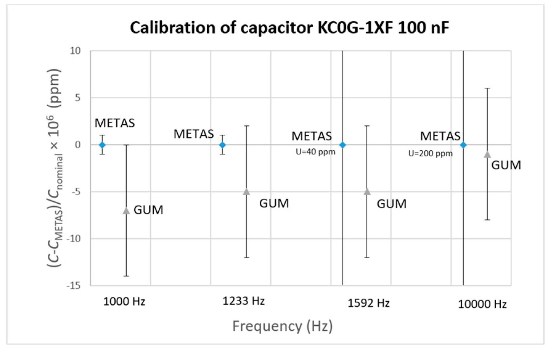 - Calibration of four GUM standard capacitors (1 nF, 10 nF, 100 nF, and 1 µF from KC0G-1XF L-52-2/21) by comparing them with the reference METAS “R” box at frequencies of 1000 Hz, 1233 Hz, and 1592 Hz.