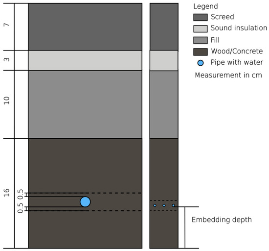 Three different depths were defined in order to analyze the embedding depth of the pipes: 6 cm, 3 cm and 1 cm. These were measured from the ceiling surface to the bottom edge of the pipe. These embedding depths were selected to model different concepts of thermal component activation. A depth of 1 cm represents activation close to the surface, which has the potential for a faster thermal reaction. The 6 cm embedding depth, on the other hand, is oriented towards classic systems with greater thermal inertia. The 3 cm variant is intended as an intermediate solution, offering a balance between reaction behavior and heat storage.