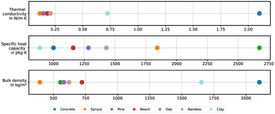 The corresponding thermal conductivities were summarized in Figure 4. Concrete had the highest thermal conductivity (2.1 W/(m·K)), while spruce had the lowest (0.112 W/(m·K)). Bamboo tops the list of bio-based materials with a value of 0.209 W/(m·K).