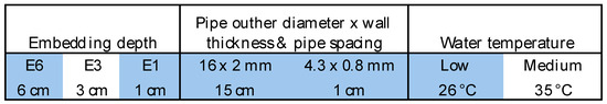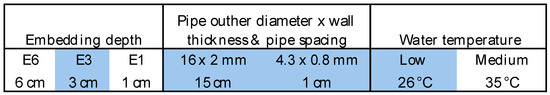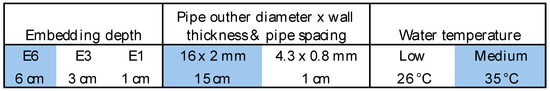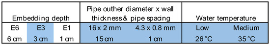 The influence of the embedding depth was analyzed by comparing 6 cm and 1 cm depths at a water temperature of 26 °C. The 16 mm pipe system and the capillary tube system were both analyzed. Figure 12 also shows the parameters used.