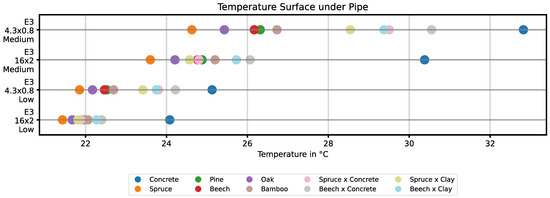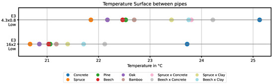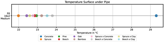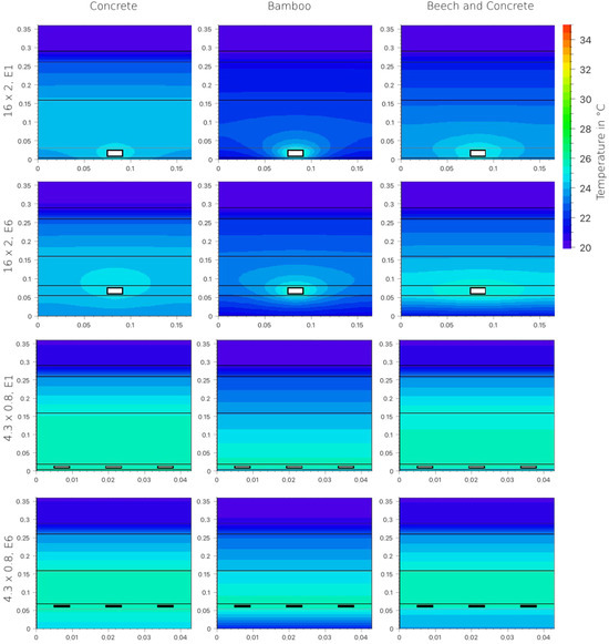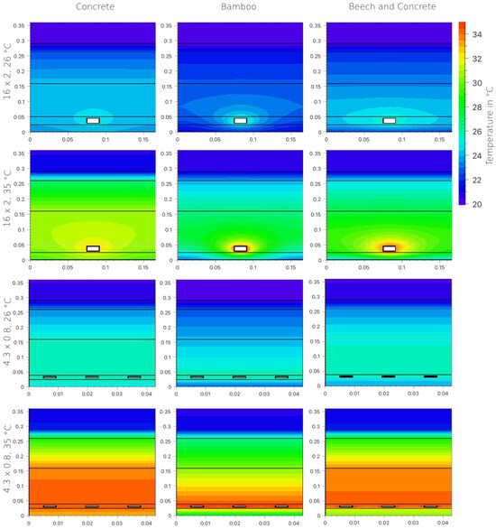 Temperatures in the center between the pipes varied depending on the material. In the 16 mm pipe system, the spruce model showed the lowest value of 22.36 °C and the spruce-concrete hybrid model showed the highest value of 24.73 °C. Concrete itself reached 24.2 °C and bamboo 22.74 °C. The temperatures can be seen in Figure 8. Further, Figure 9 shows the temperature distribution in the components for all the different materials used with a pipe diameter of 16 mm.