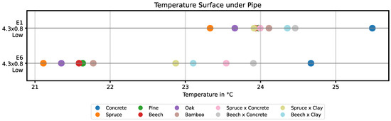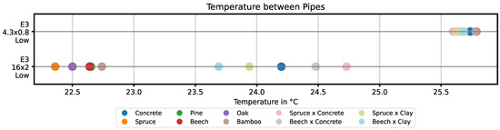 The temperature for the capillary tubes in concrete was 25.74 °C. Spruce and bamboo were almost on a par, with values of 25.79 °C and 25.78 °C, respectively—the highest values measured in this scenario. The hybrid spruce–concrete model achieved a value of 25.60 °C, the lowest measured. The corresponding distributions are shown in Figure 8 and Figure 10.