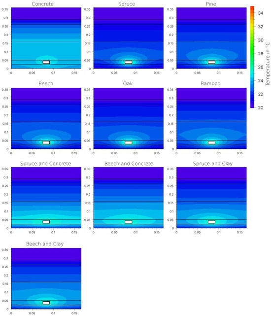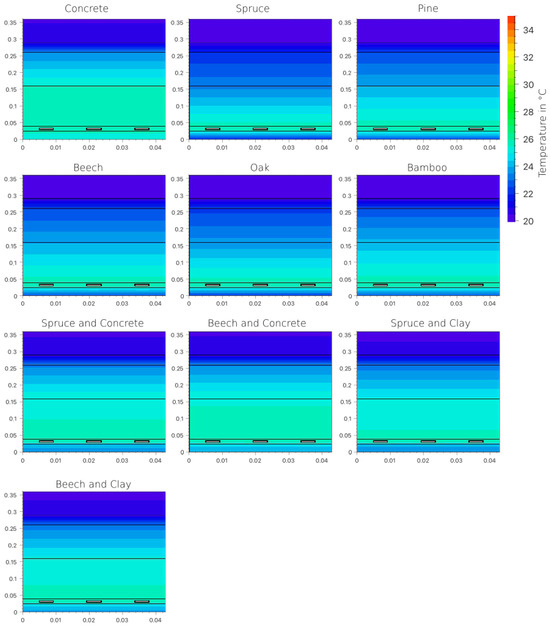 The highest temperature was measured in the concrete base material at 29.31 °C. Spruce had the lowest temperature, at 21.99 °C. Among the homogeneous, bio-based materials, bamboo showed the highest temperature of 23.22 °C. Among the hybrid variants, the combination of beech and concrete achieved 23.79 °C, closely followed by beech and loam at 23.51 °C. Depending on the material, the temperature difference interval was between 5.52 K and 7.32 K. The corresponding temperature distributions are shown in Figure 6. This clearly demonstrates the impact of the materials’ varying thermal conductivities.